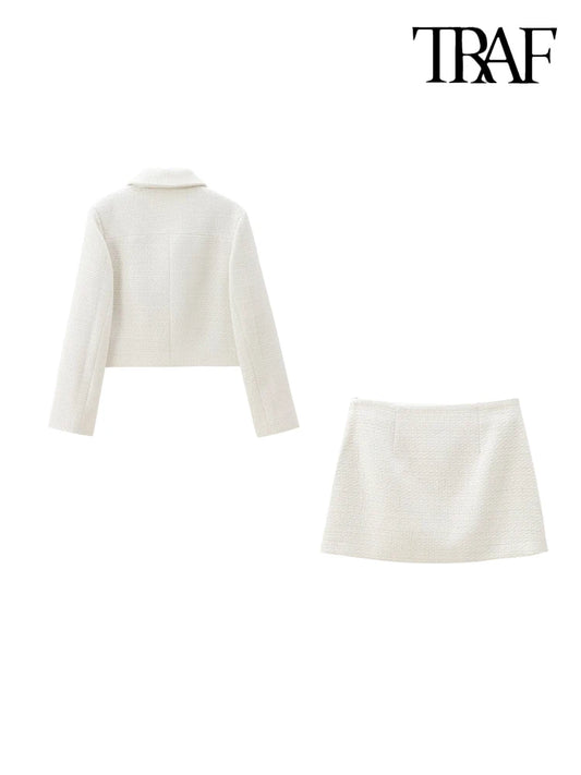 TRAF Women Fashion With Pockets Tweed Jacket Coat And High Waist Side Zipper Mini Skirt Female Two Piece Sets Mujer