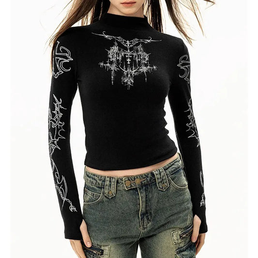 Women T-Shirt Y2k Black Vintage Clothes Half high neck Tees Grunge Fashion Gothic Graphic Streetwear Long Sleeve Crop Tops EMO