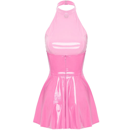 Womens Latex Swing Skirt Disco Dress Glossy Patent Leather Clubwear Halter Sleeveless Skater Mini Dress Rave Party Clubwear