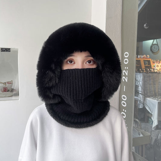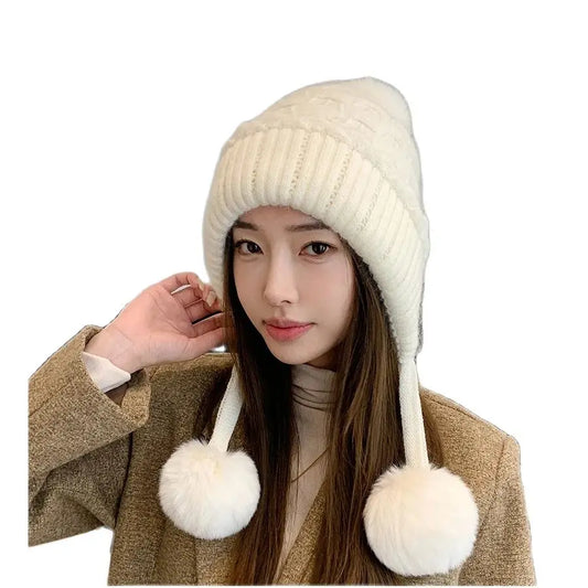 Thickened Double Layer Women Ear Protection And Cold Protection Rabbit Hair Hat With Three Fur Balls For Women Winter Plush Hat