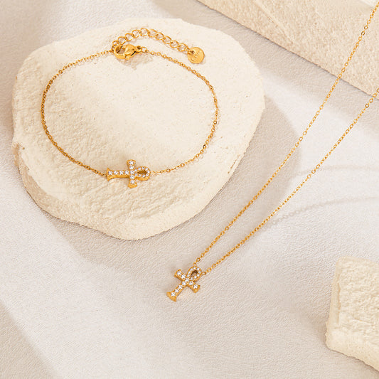 OPK Ornament Factory Fashion Commuter Style Bracelet Simple All-match Titanium Steel Full Diamond Temperament Cross Necklace Suit