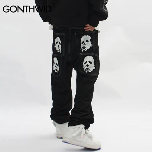 New Fashionable Black Hole Letter Embroidery Elastic Waist Men's Jeans Casual Trendy Style Mid Waist Small Foot Men's Jeans