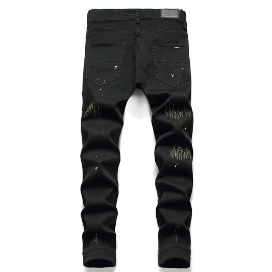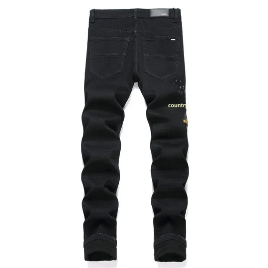 New Small Straight Black Men's Slim Fit Micro Elastic Broken Willow Nail Jeans Trendy Pants 3111