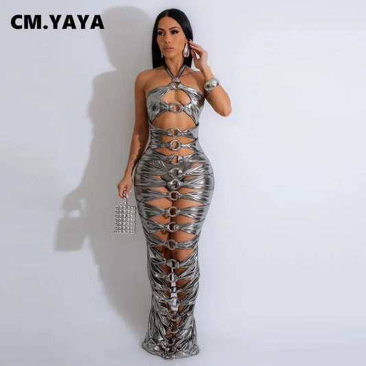 CM.YAYA Women Gilding Halter Neck Roll Hollow Out Sleeveless Birthday Bodycon Midi Maxi Dress 2024 Sexy Party Dresses Vestidos