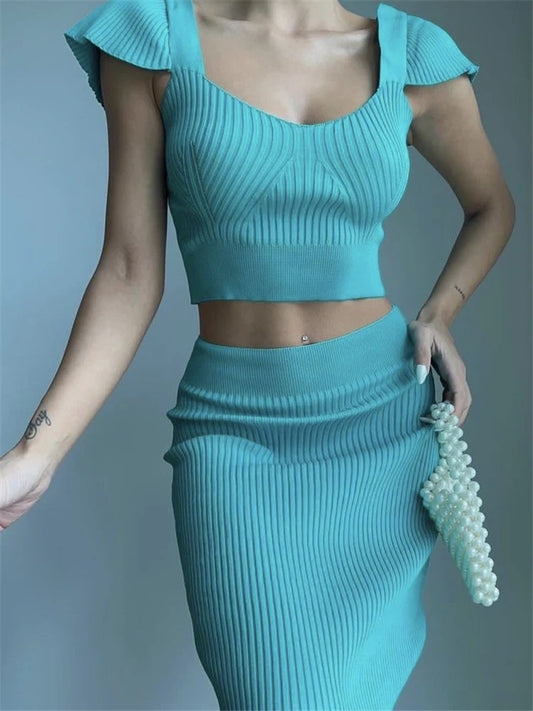 REALEFT Summer 2 Pieces 2024 New Sexy Women's Sets Knitted Tracksuits Ruffles Tank Tops and Knitted Wrap Pencil Skirts Female