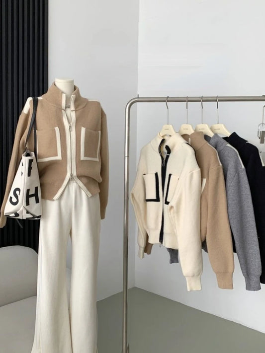 Y2k Elegant Casual Knitted Chic Jumpers Double Zipper Pockets Tender Cardigans Women Sweet Loose Stand Neck Sweaters Japanese
