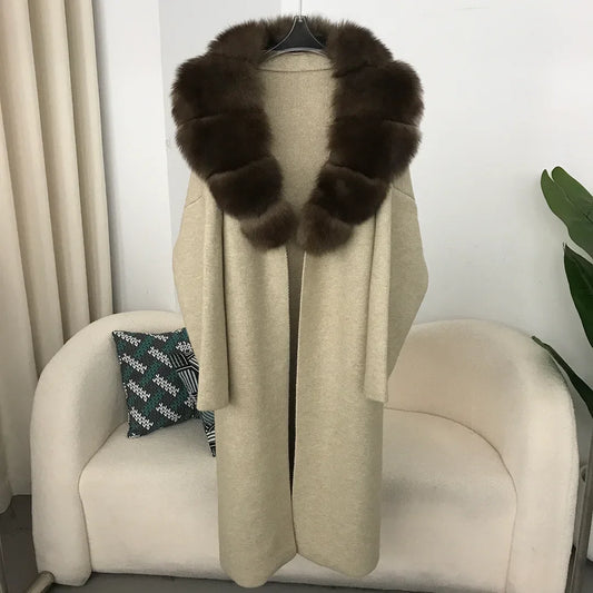 CXFS New Real Fur Coat 2024 Winter Jacket Women Natural Fox Fur Collar Belt Long Loose Thick Warm Outerwear Sweater Knitting