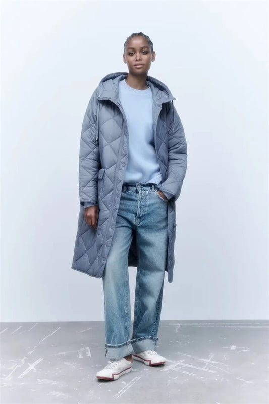 Korean Style Long Version Rhombus Hooded Cotton Jacket