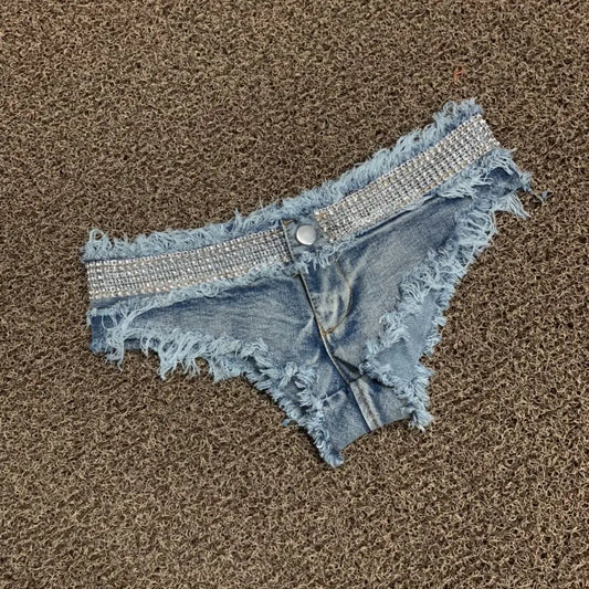 Sexy Women'S Crystal Shorts Jeans Denim Micro Mini Jean Ultra Low Rise Waist Summer Clubwear Pole Dance OS254