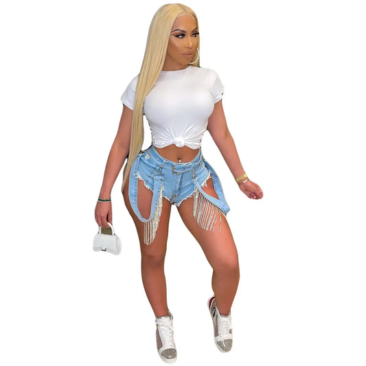 Prowow Fashion Diamond Tassel Women Shorts Summer Denim Super Short Pant New Design Y2k Style Boutique Jeans for Party Club