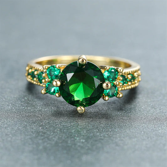 Classic Round Green Crystal Rings For Women Vintage Gold Color May Birthstone Wedding Band Engagement Jewelry Mother's Day Gifts