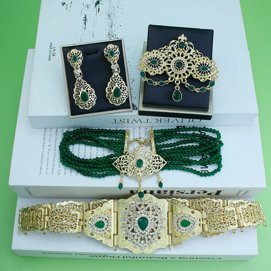 Sunspicems Morocco Bride Wedding Jewelry Sets For Women Gold Color Arabic Caftan Waist Belt Brooch Bead Choker Necklace Earrings