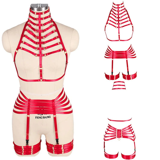 Woman Leg Harness Garter Belt Top Neck Body Cage Open Chest Bra Adjust Bondage Lingerie Punk Goth Sexy Body Harness Set