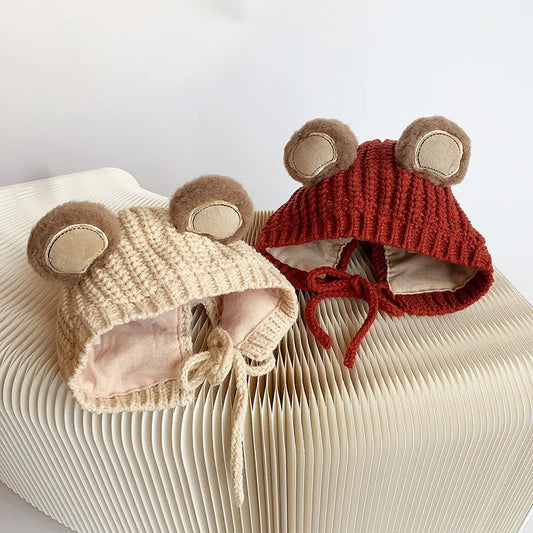 2024 Herbst-Winter-Mütze für neugeborene Mädchen mit Bären-Kaninchenohren, gestrickte Mützen für Säuglinge, mehrere Farben erhältlich, zum Schnüren, Babymützen