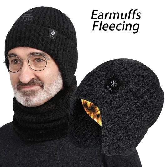 Men's Autumn/Winter Hat+Scarf Winter Warm Ear Protection Set Thick Knitted Wool Breathable Solid Color Hat