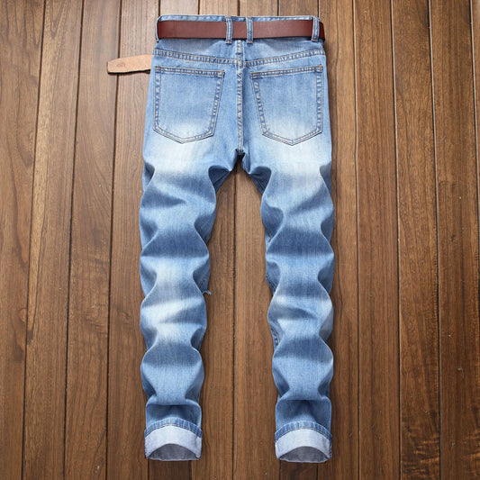 Designermode neue Herren-Retro-Hellblau-Jeans Stretch Slim Fit perforierte Blumenflecken Spleißen Jeans High Street Hip-Hop-Br