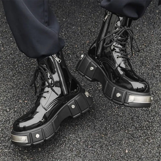 2024 Herren High Top Britischer Stil Dicke Unterseite Erhöhtes helles Leder Schwarz Motorrad Runde Zehen Seitlicher Reißverschluss Punk Stiefel Damen