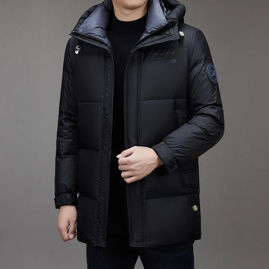 Leichte Luxus-Daunenjacke für Herren, lang, Winter 2024, trendig, 90 % weiße Entendaunen, warmer Mantel, Business-Casual-Mütze, leichte Daunenjacke