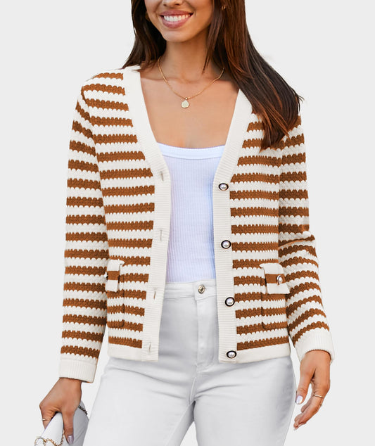 Casly Lamiit Damen Strickjacken 2024, modisch, elegant, mit goldenen Knöpfen, leicht, gestreifte Strickjacken, Lounge-Strick-Oberbekleidung, Braun, Apricot, Streifen, XL
