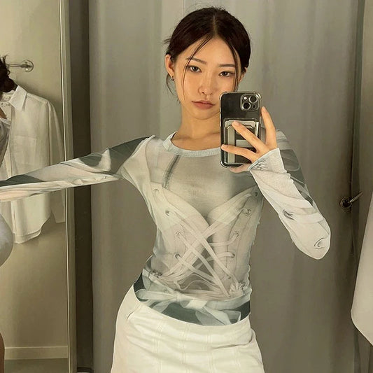CUTENOVA Herbst-Bluse mit elastischen Trägern und Aufdruck, runder Kragen, lange Ärmel, Hemd, Harajuku, Y2K, schmale transparente Oberteile für Mädchen