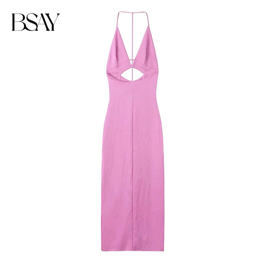 BSAY Women Fashion Hollow Design Satin Texture Sleeveless Halter Backless Long Dresses Chic Female Vintage Evening Dress