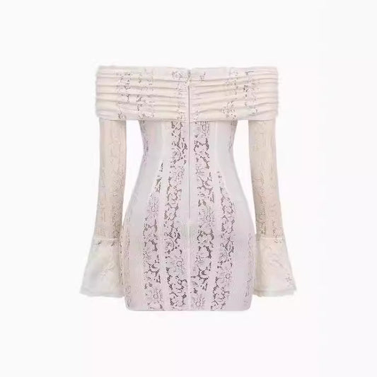 Schulterfreies, langärmliges, schmales Spitzenkleid