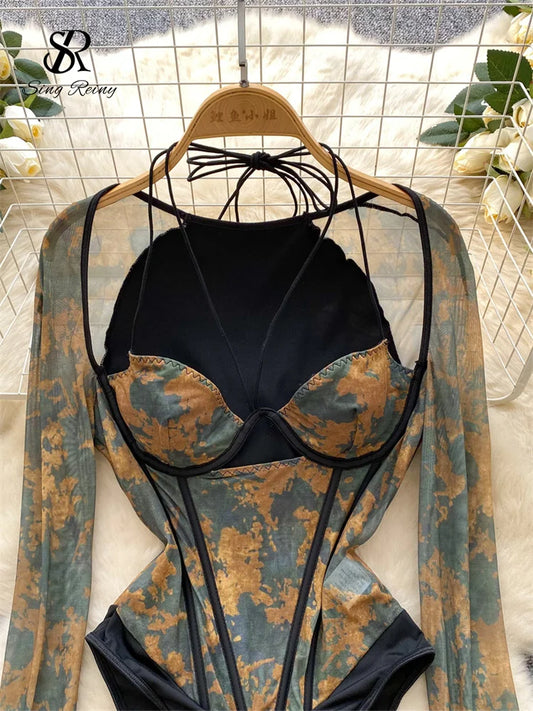 SINGREINY Halter Gauze Print Sexy Rompers Women Spliced Long Sleeve Playsuits Fashion Retro Open crotch Corset Ladies Bodysuits