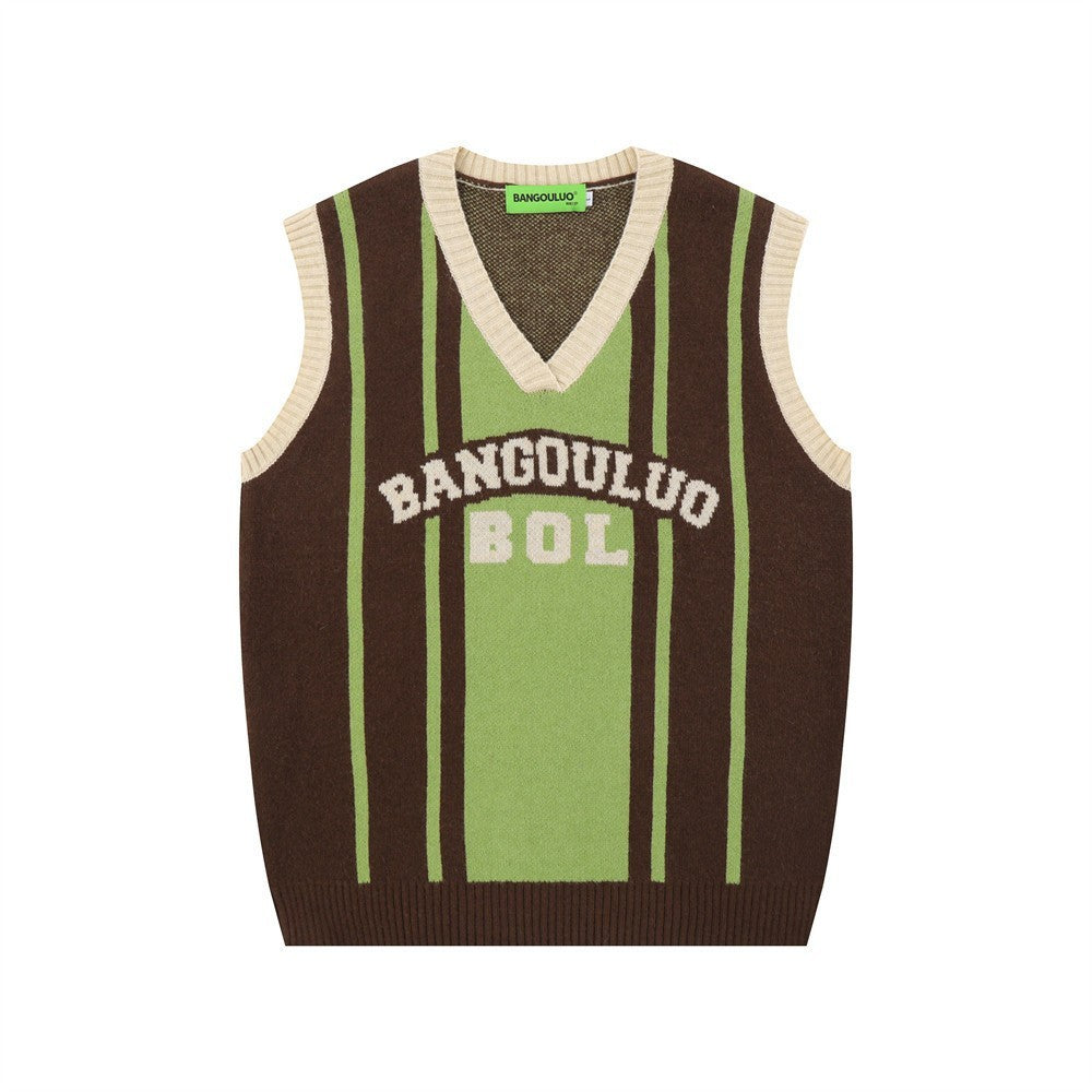 Europäische und amerikanische Straßen-Pulloverweste mit farblich passenden Buchstaben und V-Ausschnitt aus Jacquard
