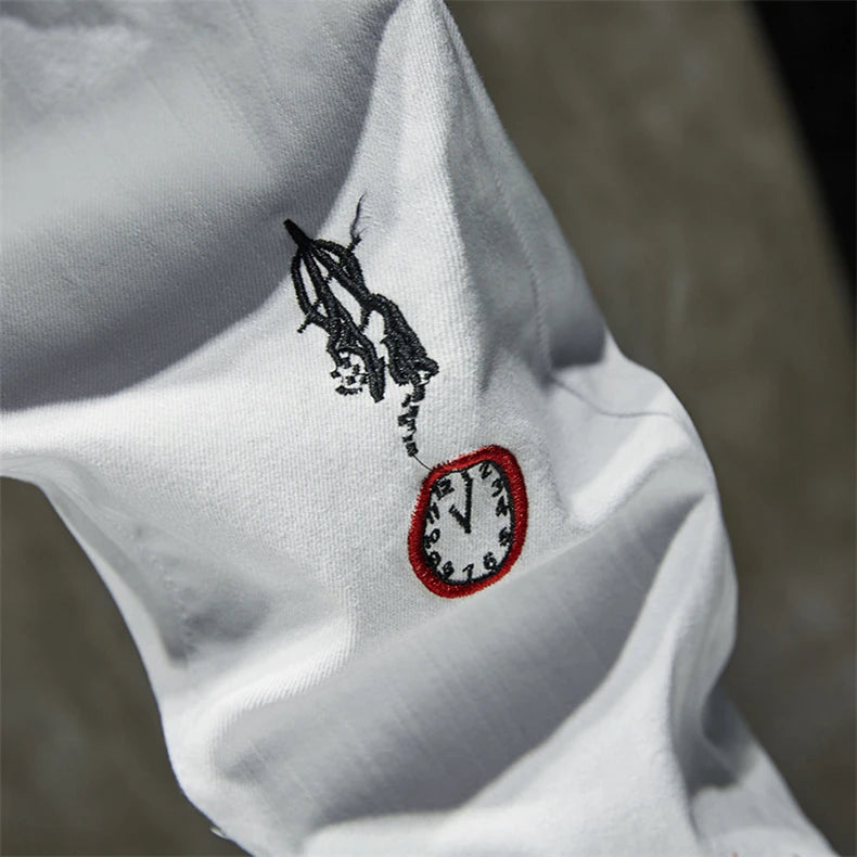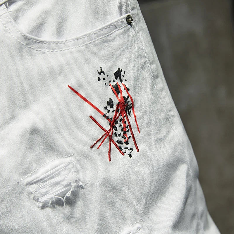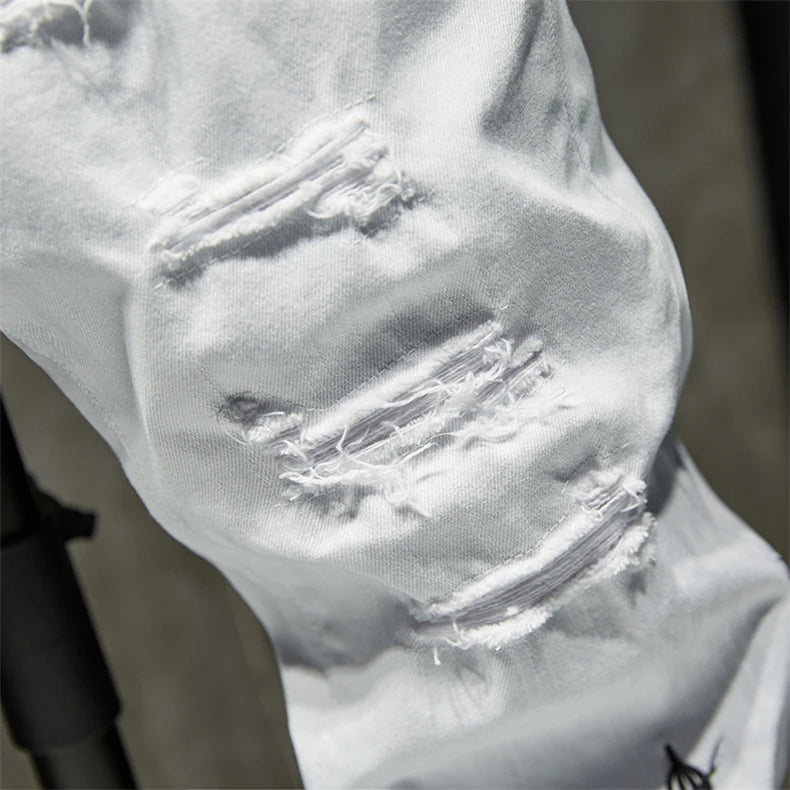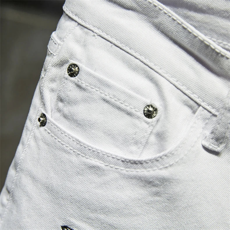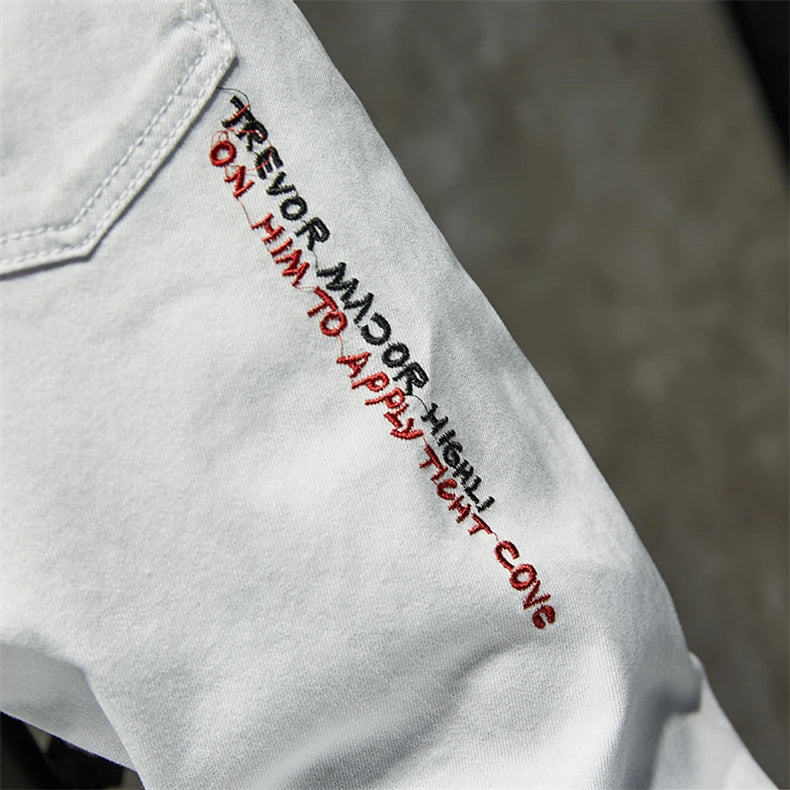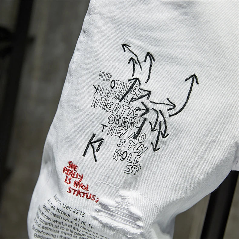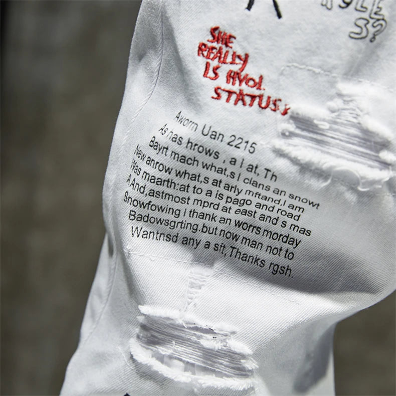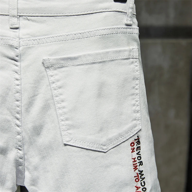 Mode Trendy Stickerei Buchstaben Männer College Jungen Skinny Runway Zipper Denim Hose Destroyed Zerrissene Jeans Schwarz Weiß Jeans