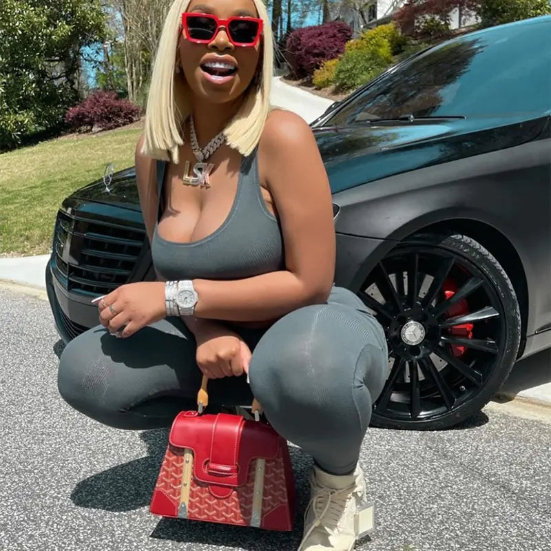Verbessern Sie Ihre Sportbekleidung mit unserem Gym Crop Tank Top Leggings Set! Dieses zweiteilige Ensemble wurde für Komfort, Leistung und Stil entwickelt und definiert neu, was Sportbekleidung sein kann. Verabschieden Sie sich von sperriger und einengender Sportbekleidung. Unser Set ist aus leichtem und atmungsaktivem Rippenstrickmaterial gefertigt und bietet maximale Bewegungsfreiheit bei müheloser Passform. Darüber hinaus sorgen seine schweißableitenden Eigenschaften dafür, dass Sie selbst bei den intensivsten Trainingseinheiten kühl und trocken bleiben. Aber dieses Set ist nicht nur für das Fitnessstudio geeignet – es ist auch perfekt für den Alltag! Egal, ob Sie Besorgungen machen oder faulenzen, sein stylischer, lässiger Streetwear-Look hält Sie im Trend und bequem. Geben Sie sich nicht mit gewöhnlicher Sportbekleidung zufrieden. Werten Sie Ihre Garderobe mit unserem Gym Crop Tank Top Leggings Set auf und bleiben Sie in Sachen Mode immer einen Schritt voraus.