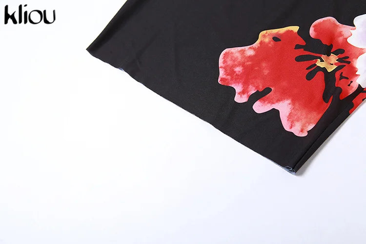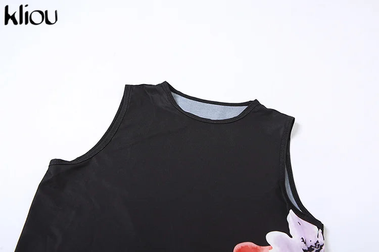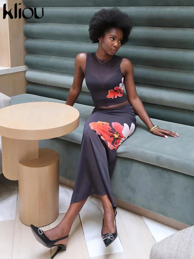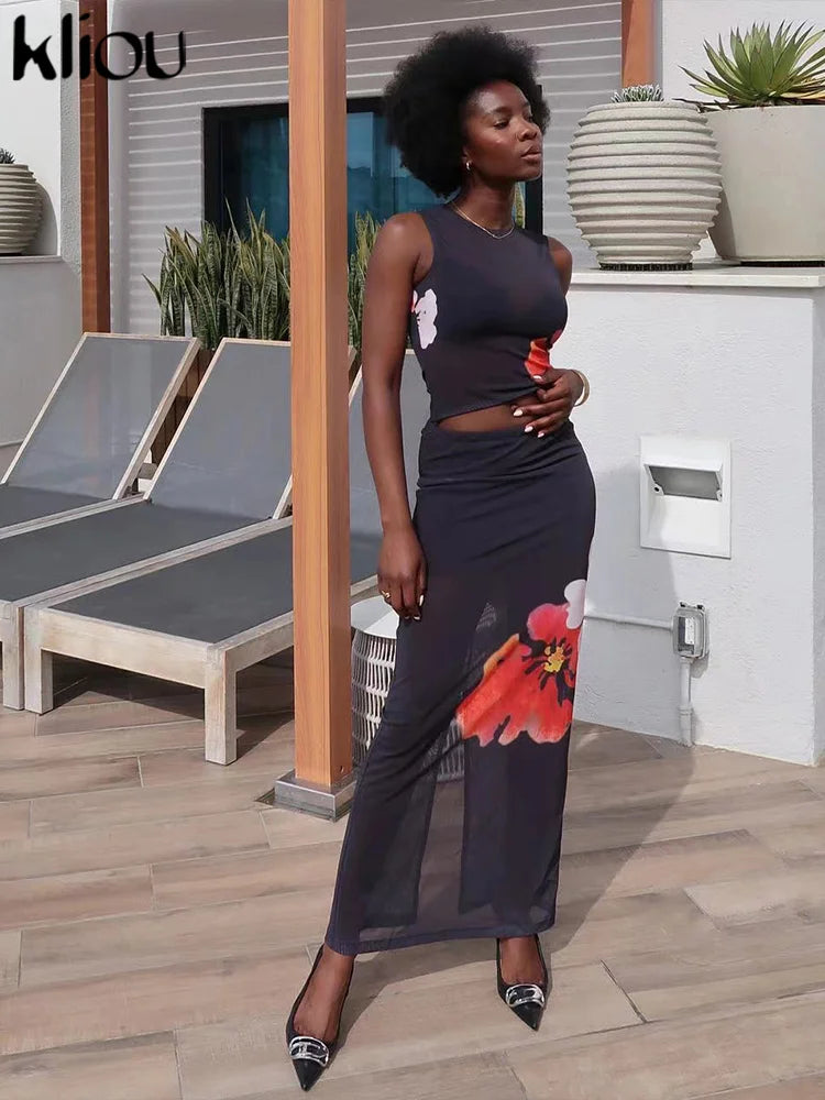 Kliou Vintage Folower Print Zweiteiliges Set für Damen, sexy, durchsichtige Netz-Weste + schmaler Rock mit hoher Taille, passende Outfits für Damen