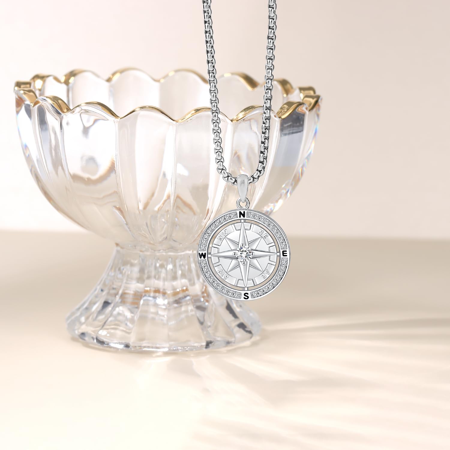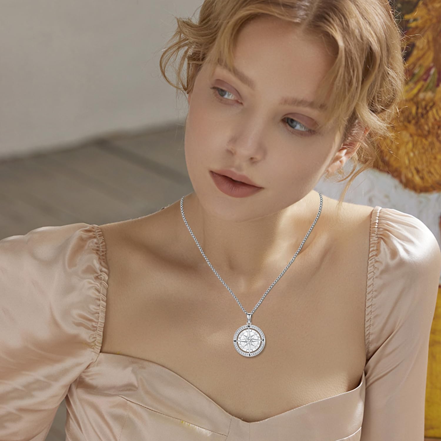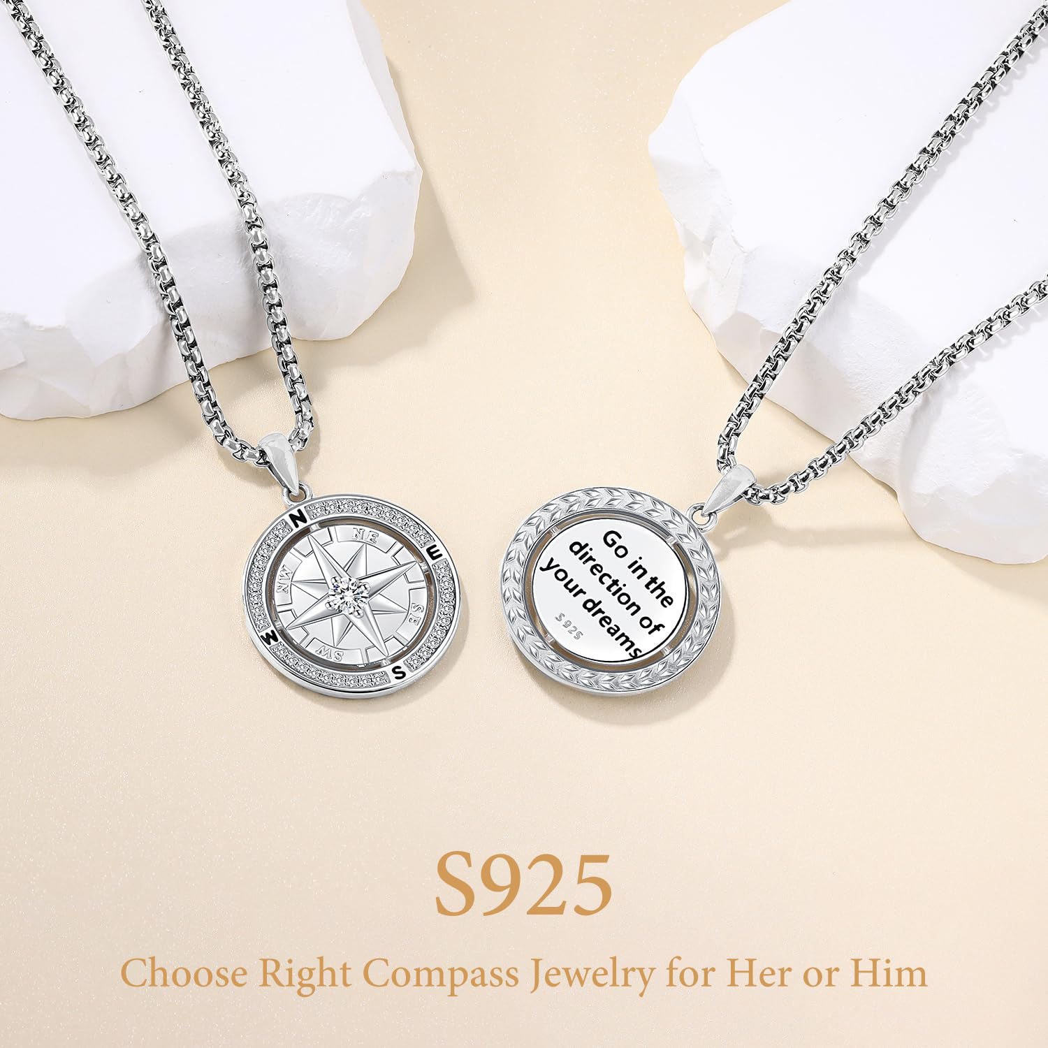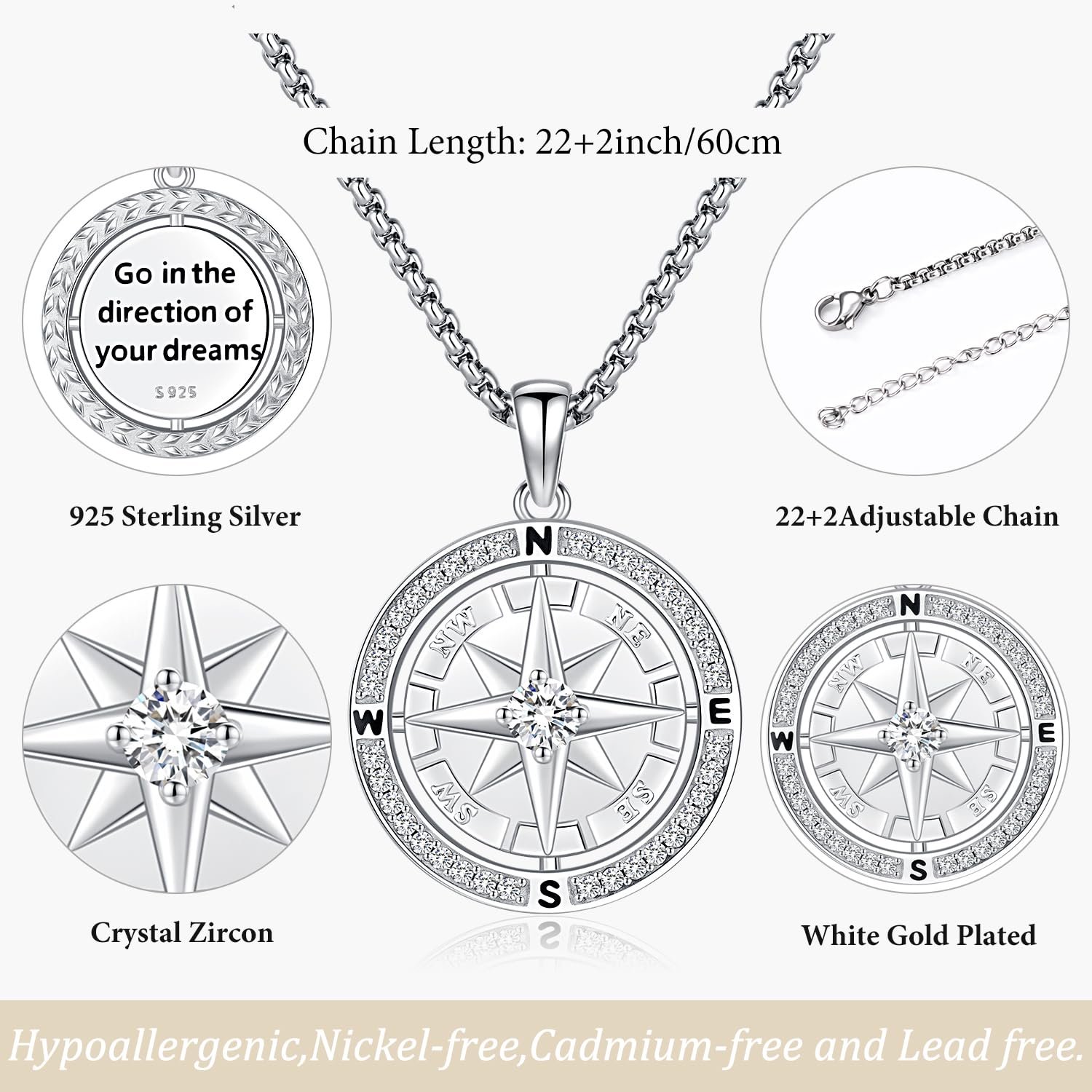 - ⚫ 925 Sterling Silber – Der Kompass-Anhänger besteht aus 925er Sterlingsilber, ist frei von Blei, Nickel und Cadmium, hypoallergen und SGS-geprüft, besetzt mit Zirkon der Güteklasse 5A. Der Kompass-Anhänger ist doppelseitig mit der Gravur „Go in the Direction of Your Dreams“ auf der Rückseite.