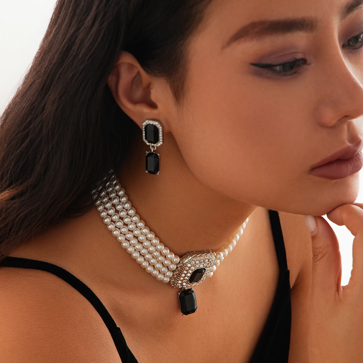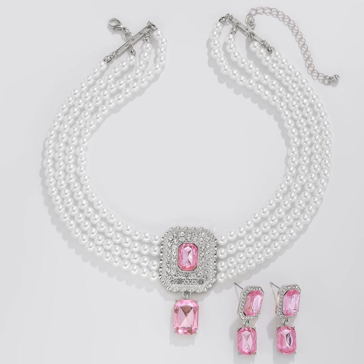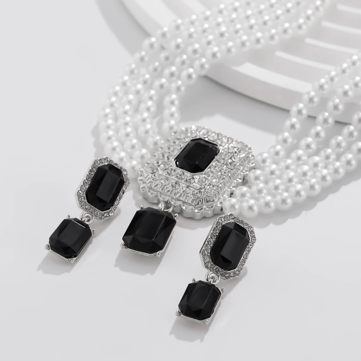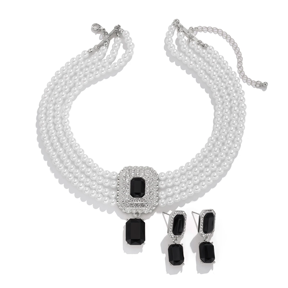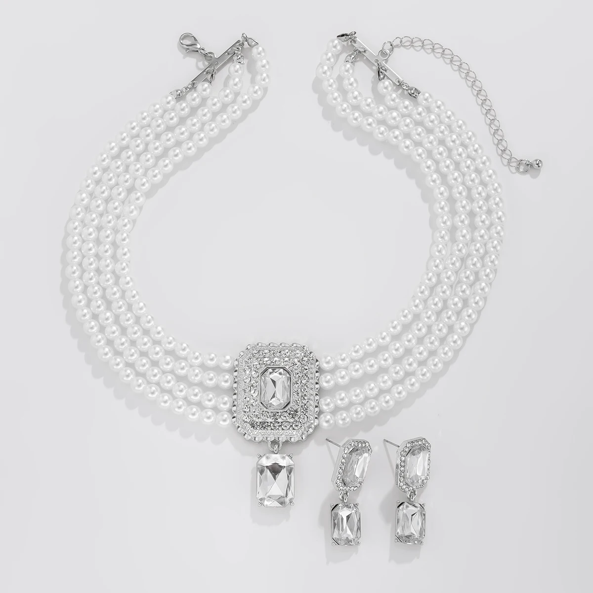 Lacteo Retro 2Pcs/Set Multi Layer Imitation Pearl Chain Necklace Stud Earrings Women Elegant Wedding Banquet Jewelry Suit New