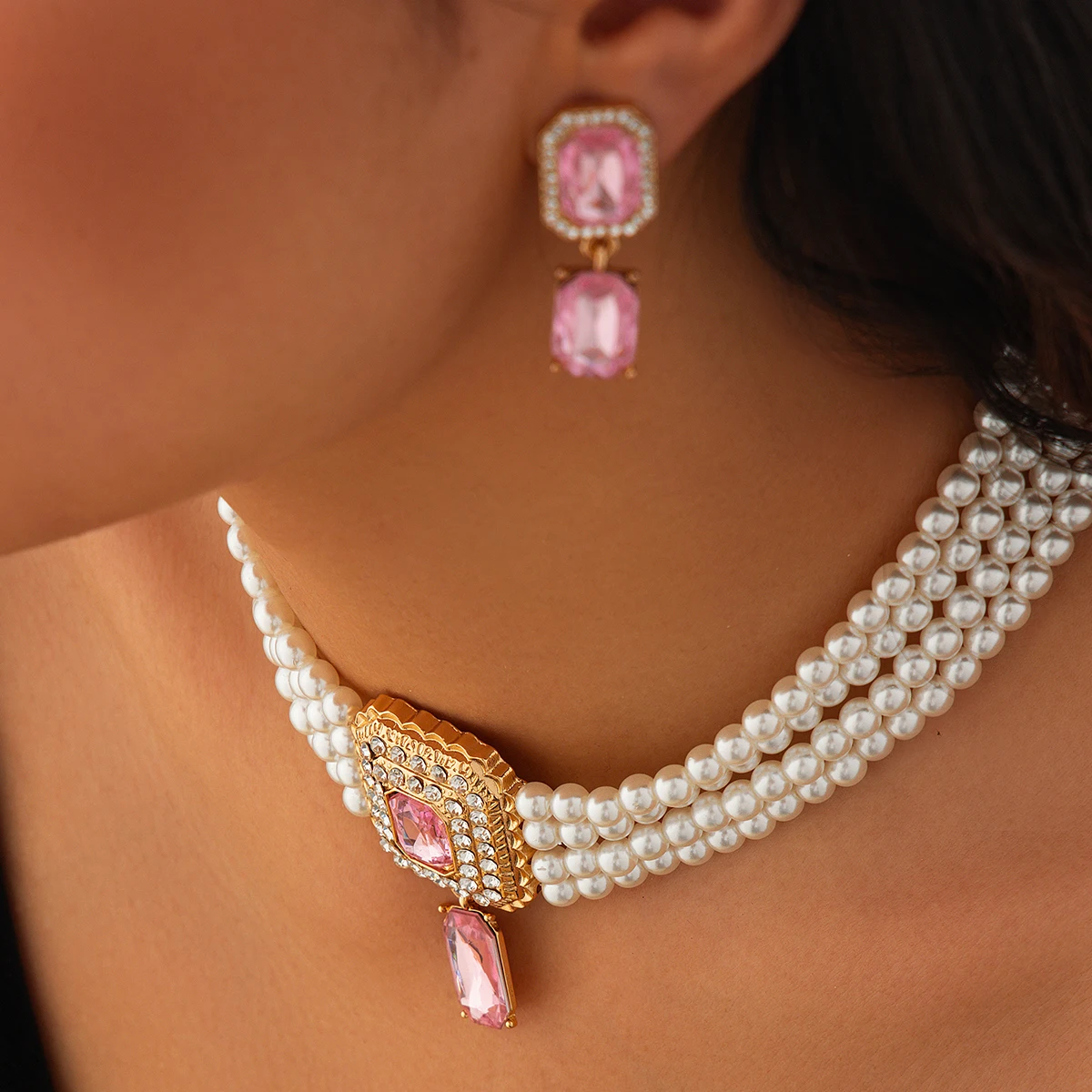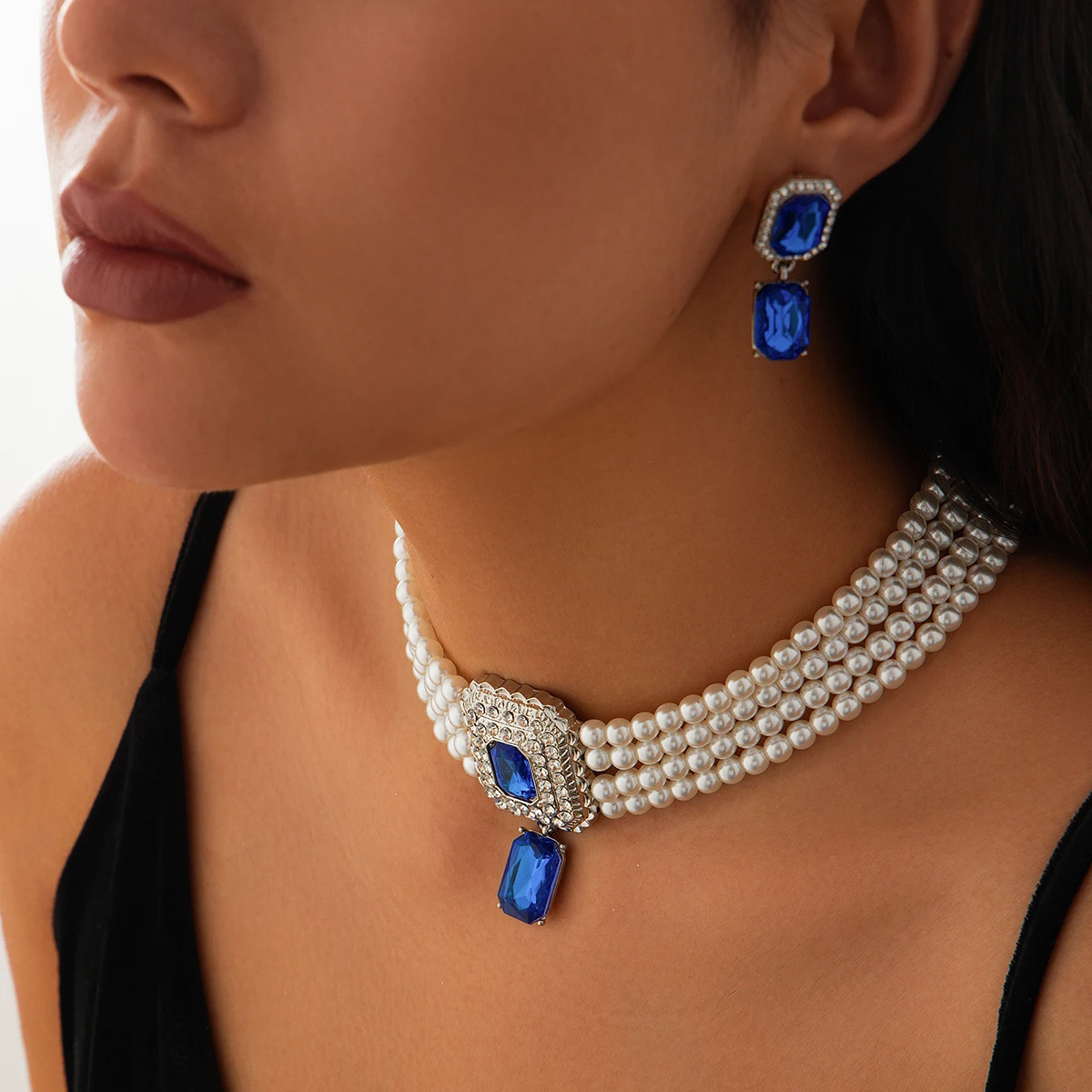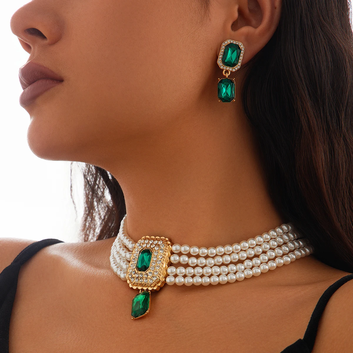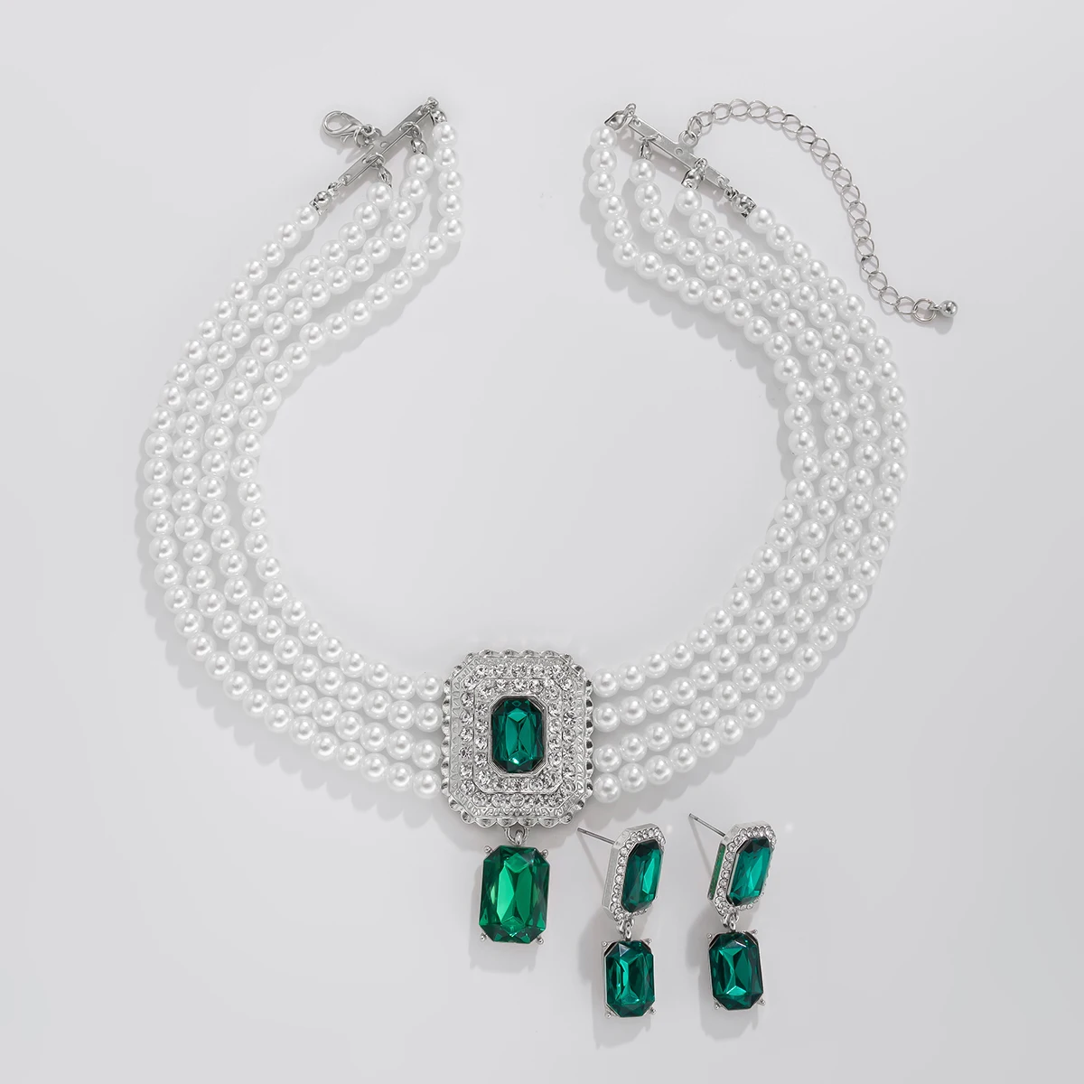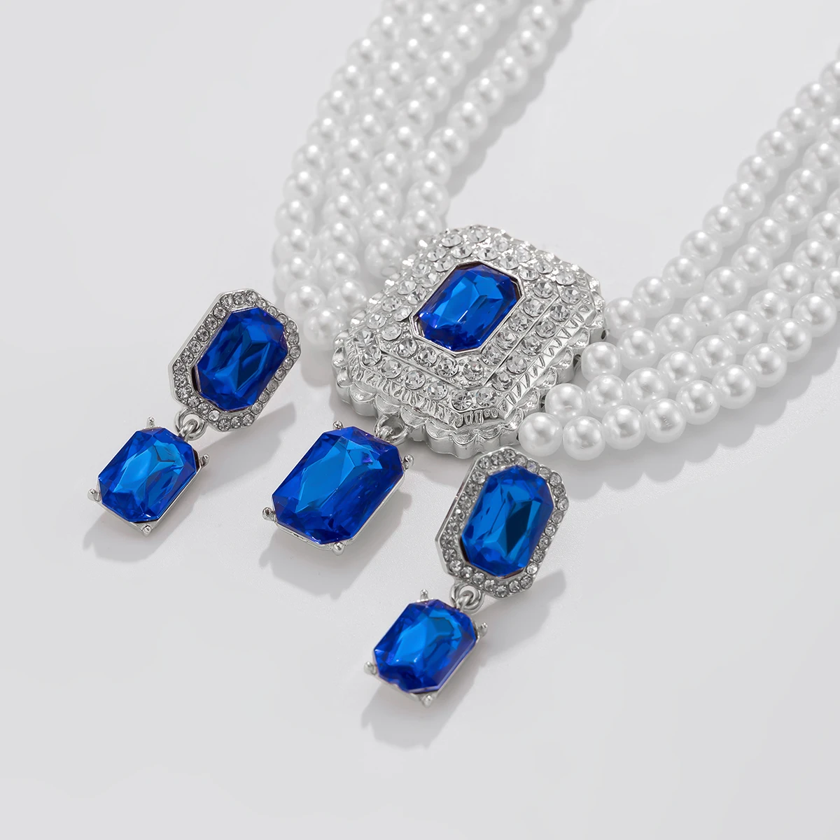 Lacteo Retro 2Pcs/Set Multi Layer Imitation Pearl Chain Necklace Stud Earrings Women Elegant Wedding Banquet Jewelry Suit New