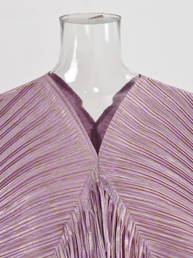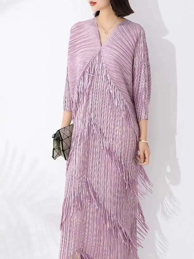 LANMREM 2025 New Elegant Party Tassel Pleated Dress Women V Neck Sequins Spliced Irregular Long Dresses Fashion Clothing 2DA1641