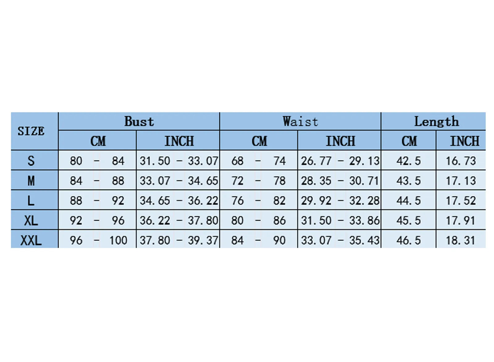 | Size:XXL | Bust:96-100cm/37.80-39.37'' | Waist:84-90cm/33.07-35.43'' | Length:46.5cm/18.31'' |