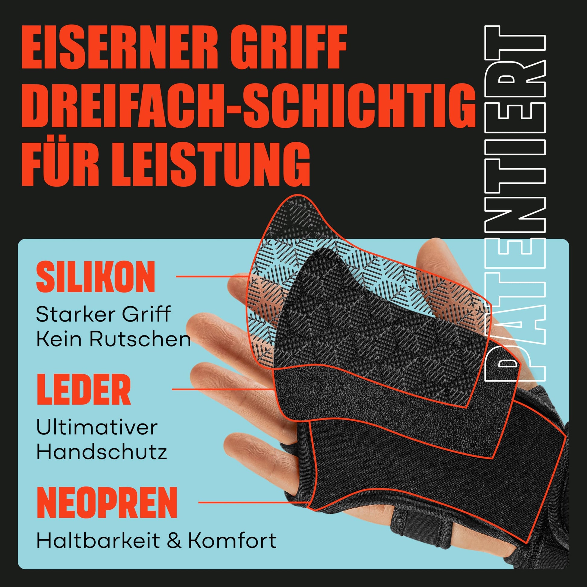 - EXTRA LEDER- UND SILIKONPOLSTERUNG: Fitness-Handschuhe Herren und Handschuhe Fitness Damen aus Neopren, verstärkt mit Leder und Silikon für besten Handflächenschutz.