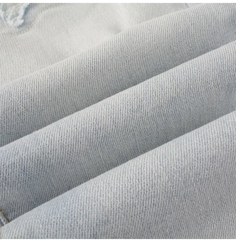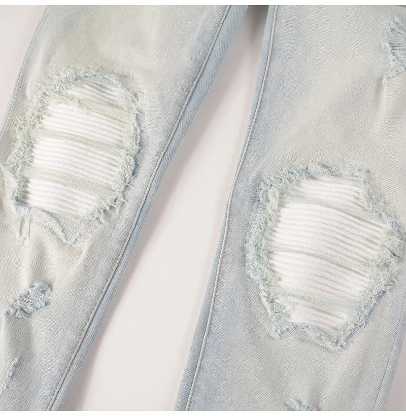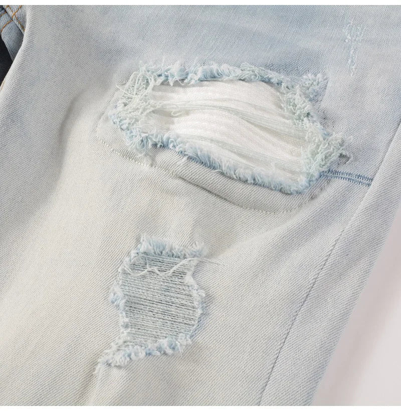Herren Hellblaue Bikerjeans mit Rissen, Plissee-Patch, Patchwork-Stretch-Jeans, Streetwear-Löcher, zerrissene Röhrenhose