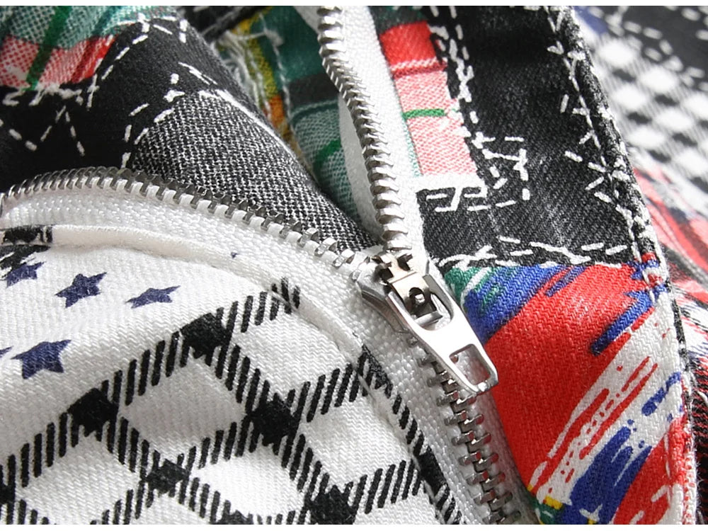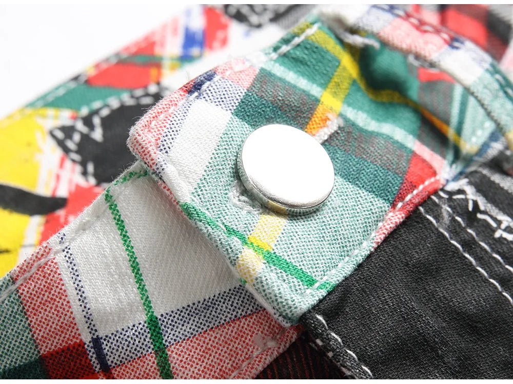 Männer Plaid Digital Print Jeans Mode Patches Patchwork Stretch Denim Hosen Schlank Gerade Hose