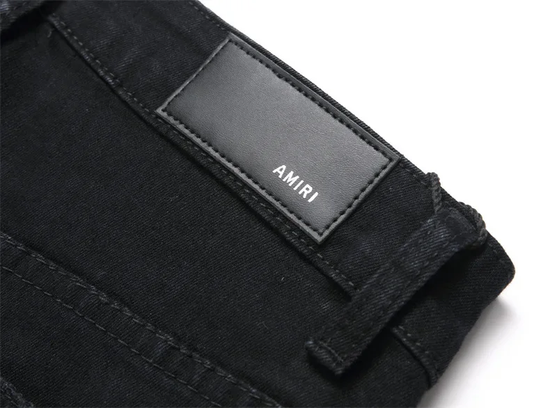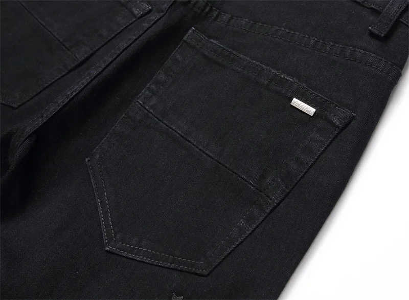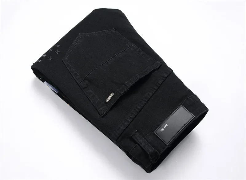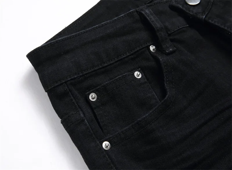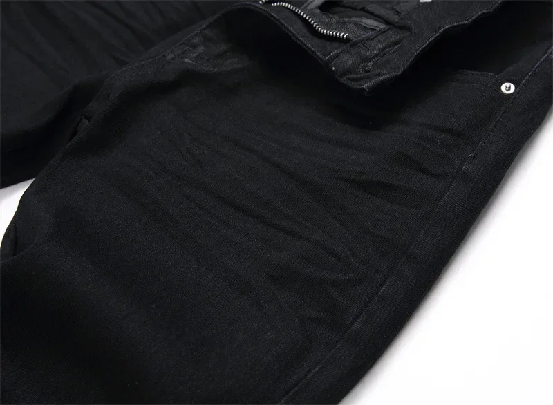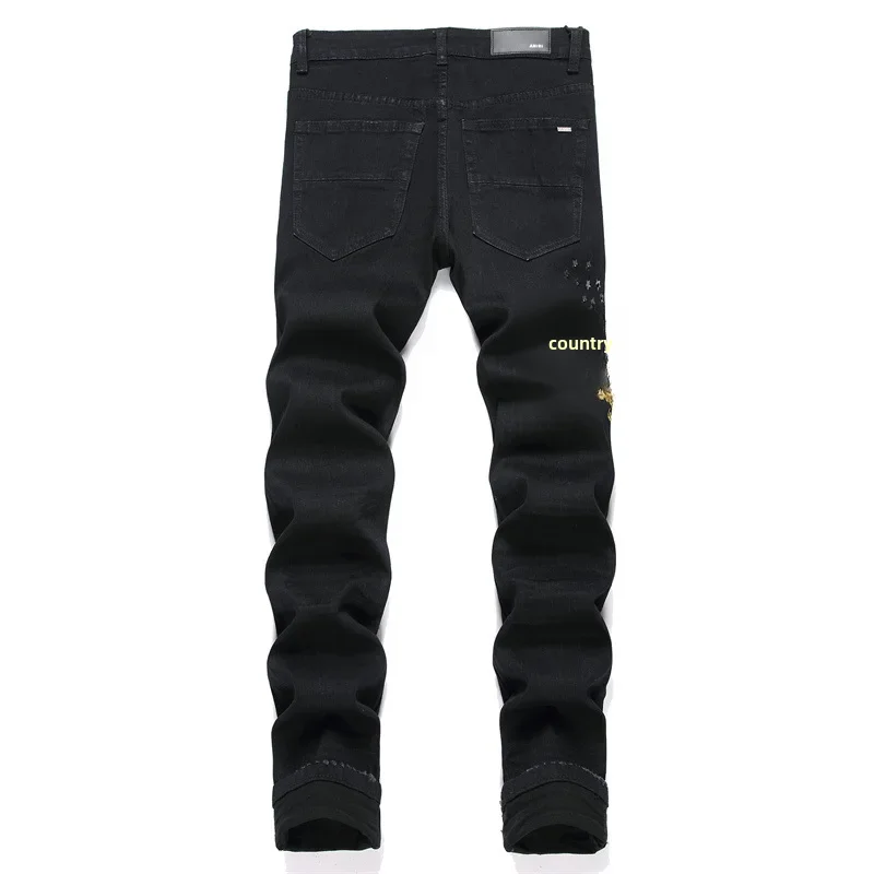 New Fashionable Black Hole Letter Embroidery Elastic Waist Men's Jeans Casual Trendy Style Mid Waist Small Foot Men's Jeans