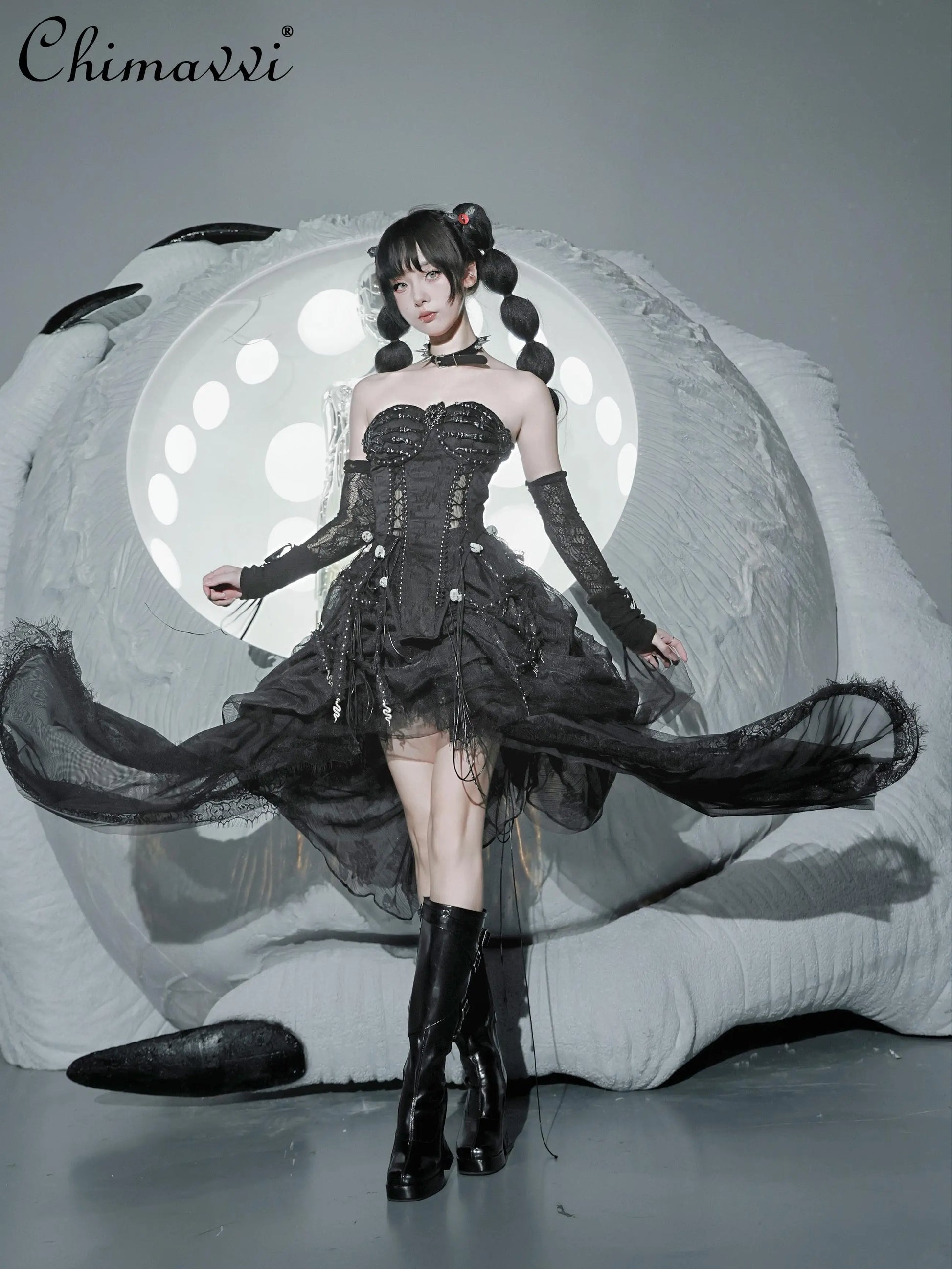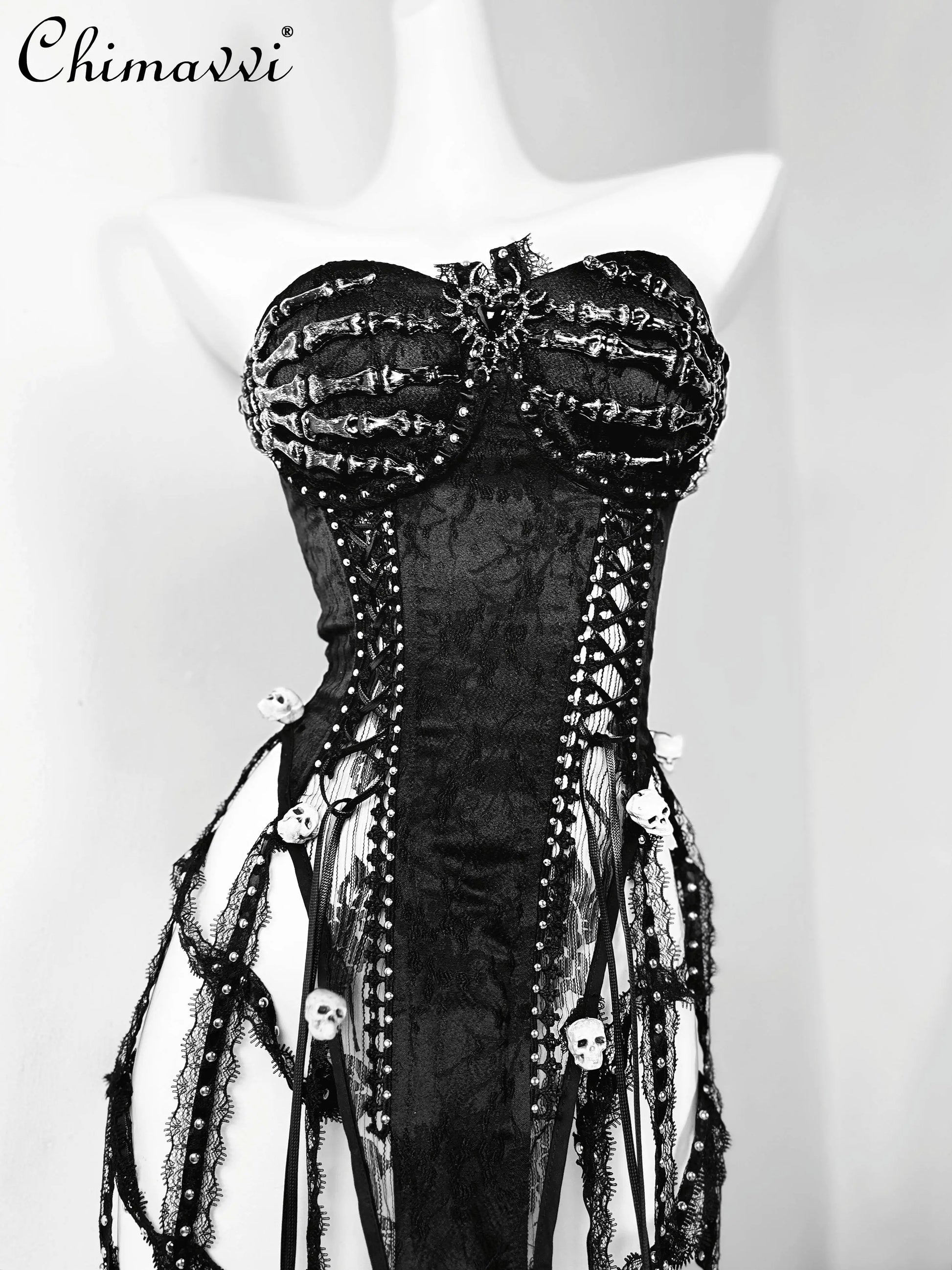 Original Punk Dark Girls Handmade Goth Skull Black Strap Drawstring Corset Bird Cage Lace Tassel Tube Top Long Trailing Skirt