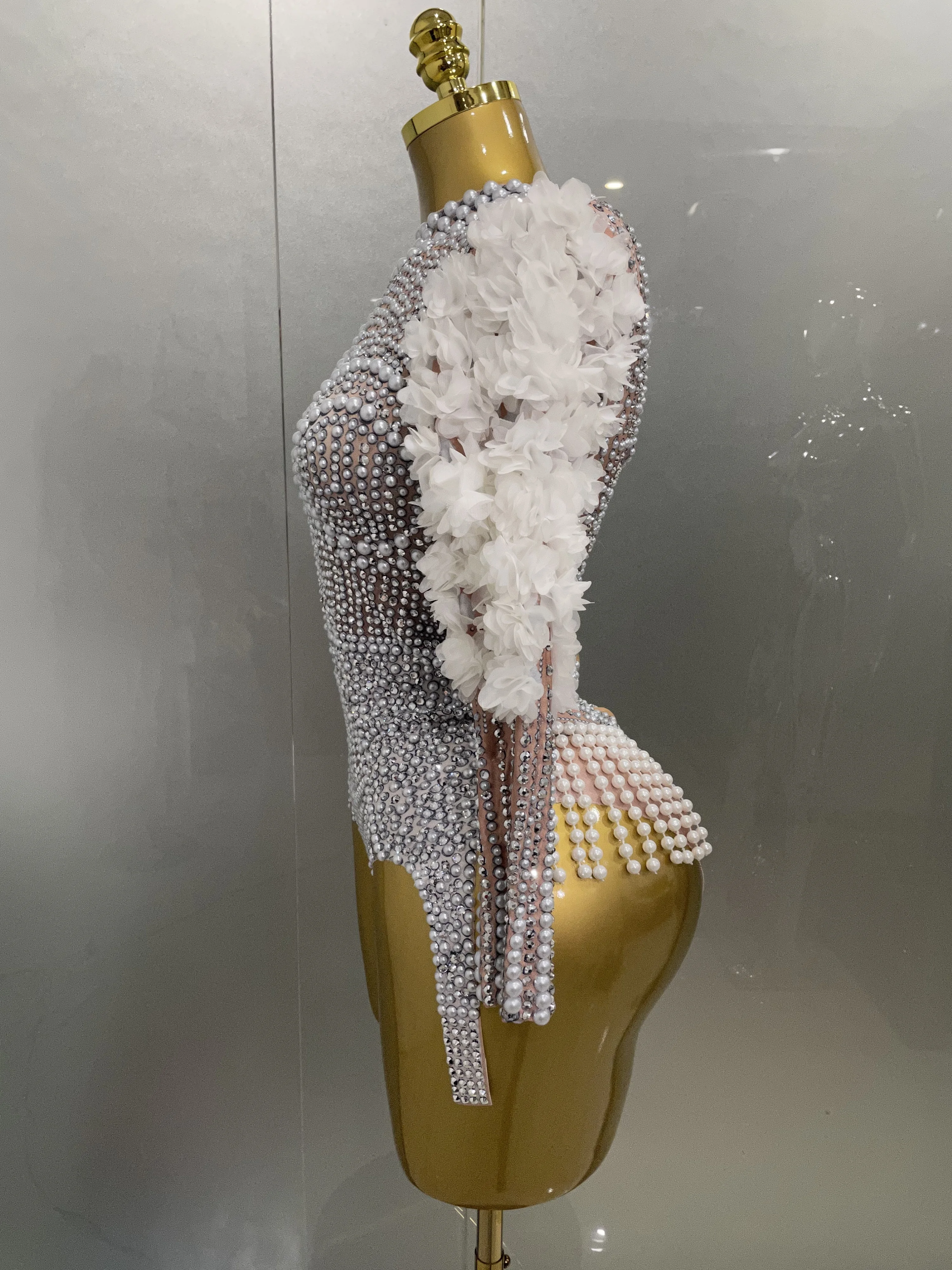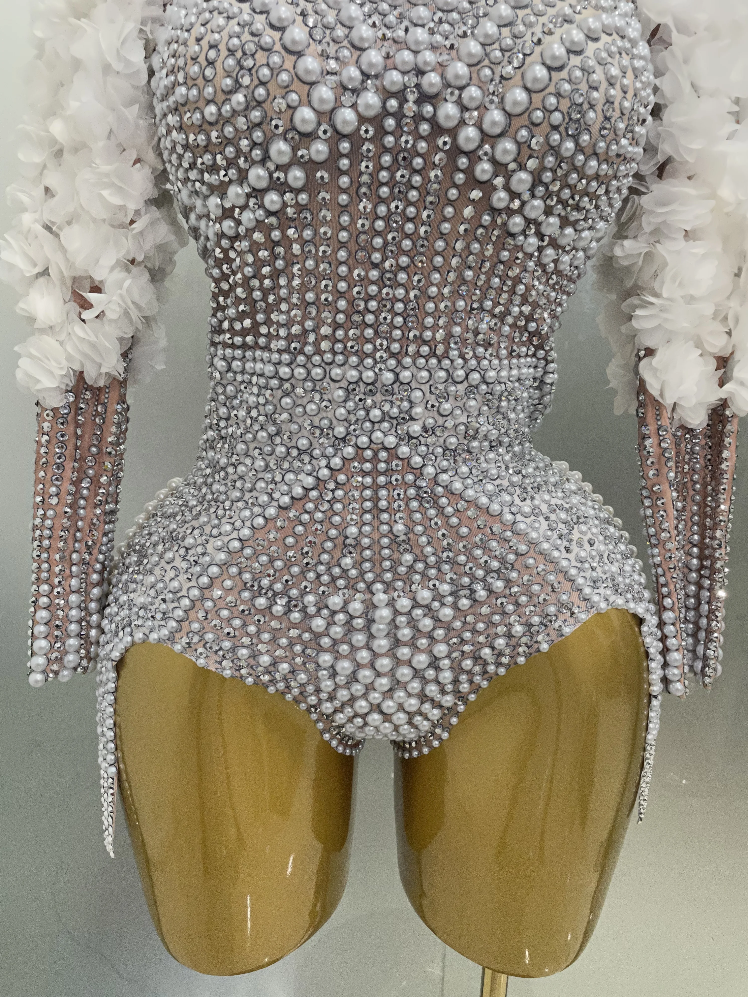 Sexy Luxury Sparkle Diamond Pearls Flower Bodysuits 2025 Women Birthday Party Leotard Dancer Nightclub Performance Stage Outfit