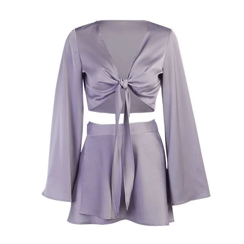 Y2k Two Piece Set Women Autumn White Lantern Long Sleeve Crop Cardigan Tops Elegant Suits Lace Up Wrap Sexy Mini Skirts