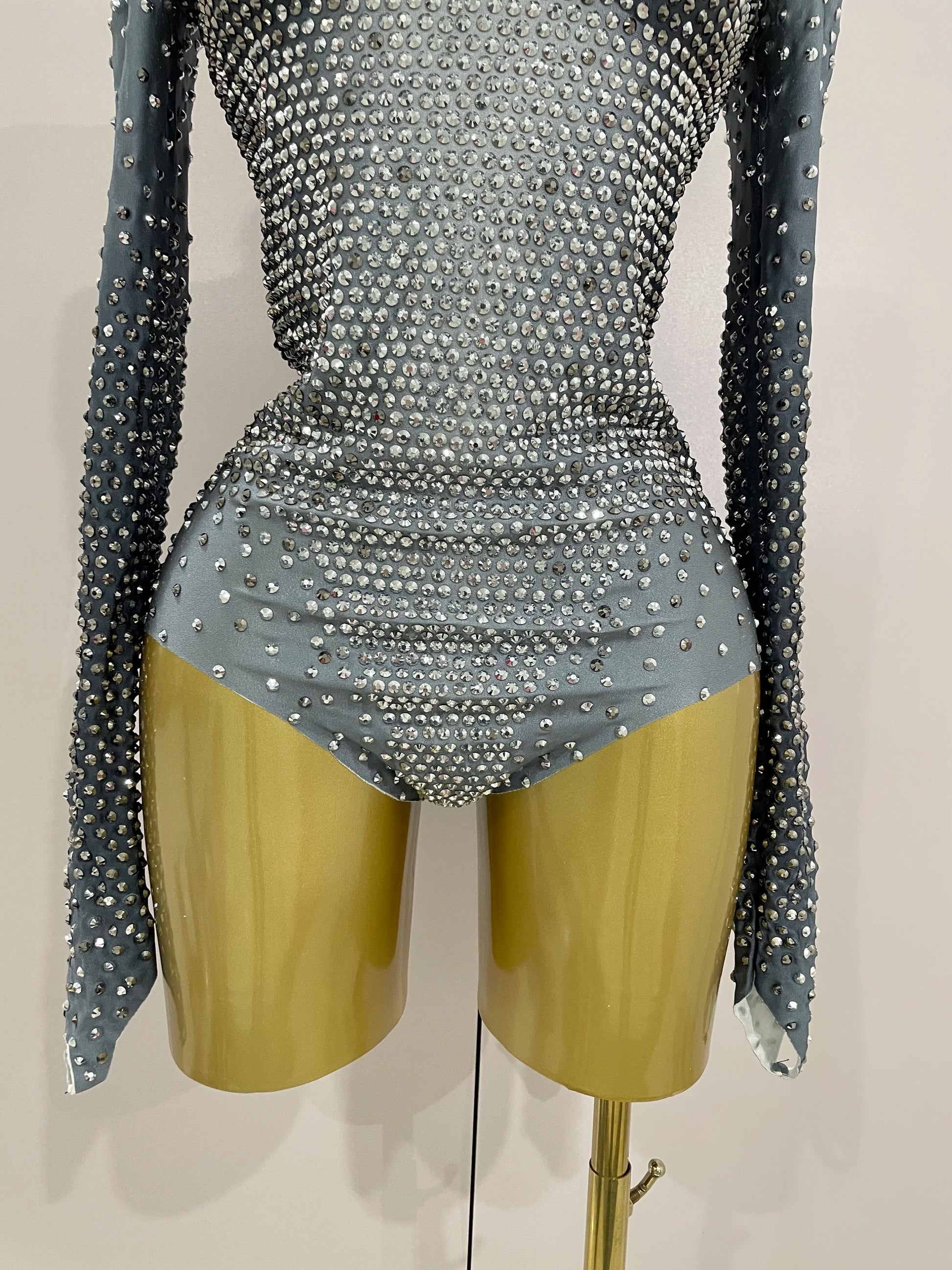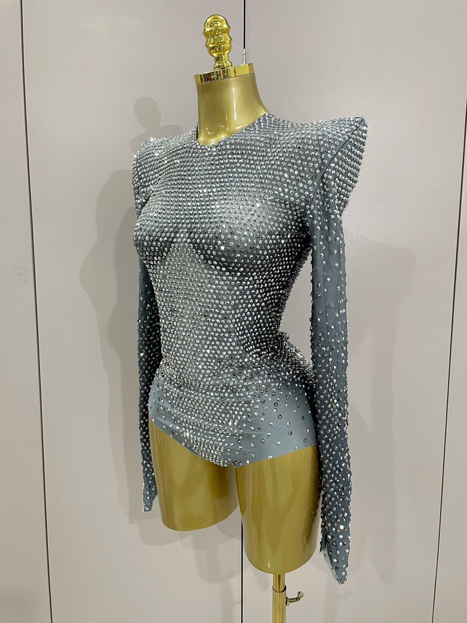 Sparkle Silver Rhinestones Long Sleeve Stretch Bodysuits New Women Evening Luxury Birthday Party Sexy Nightclub Stage Costu