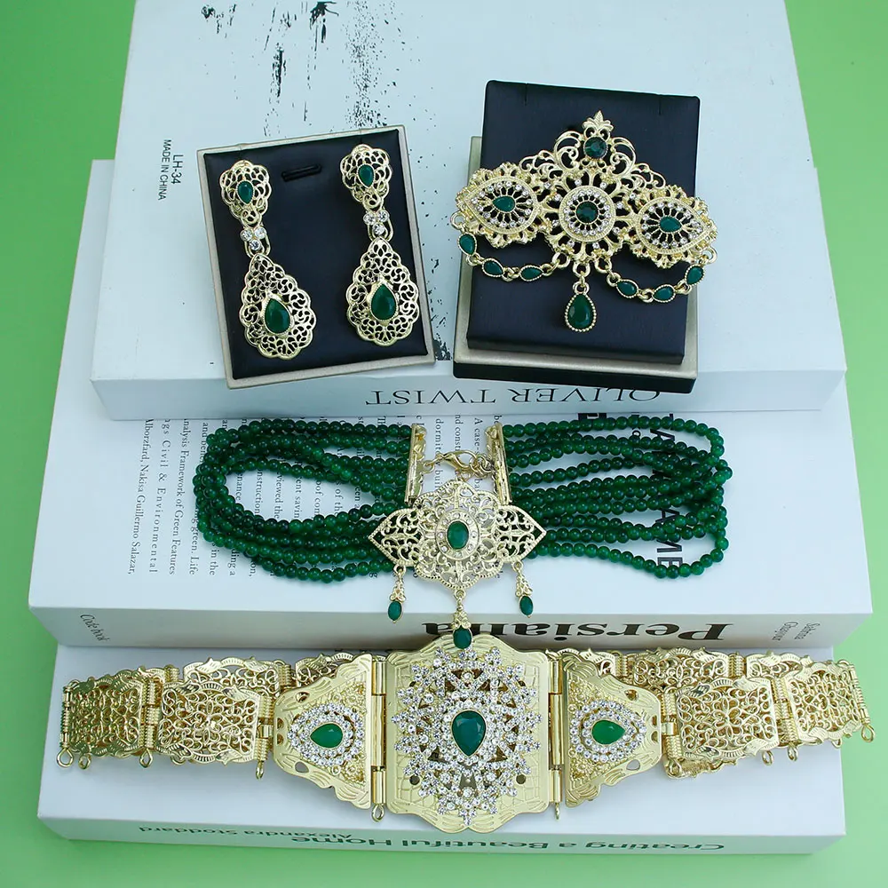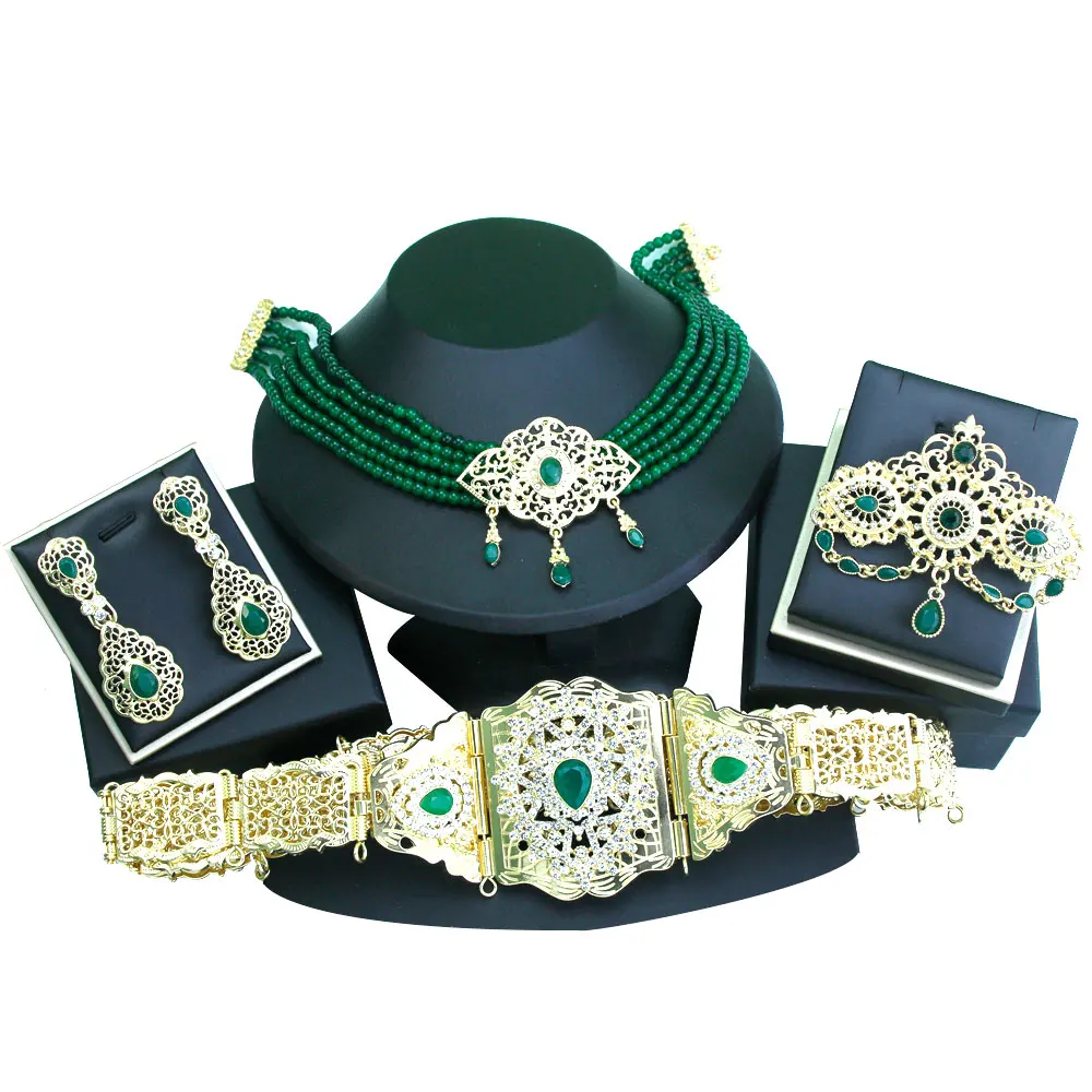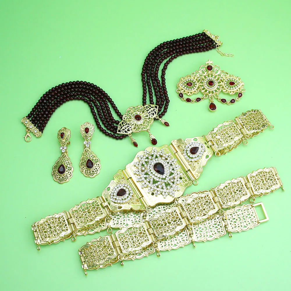 Sunspicems Morocco Bride Wedding Jewelry Sets For Women Gold Color Arabic Caftan Waist Belt Brooch Bead Choker Necklace Earrings