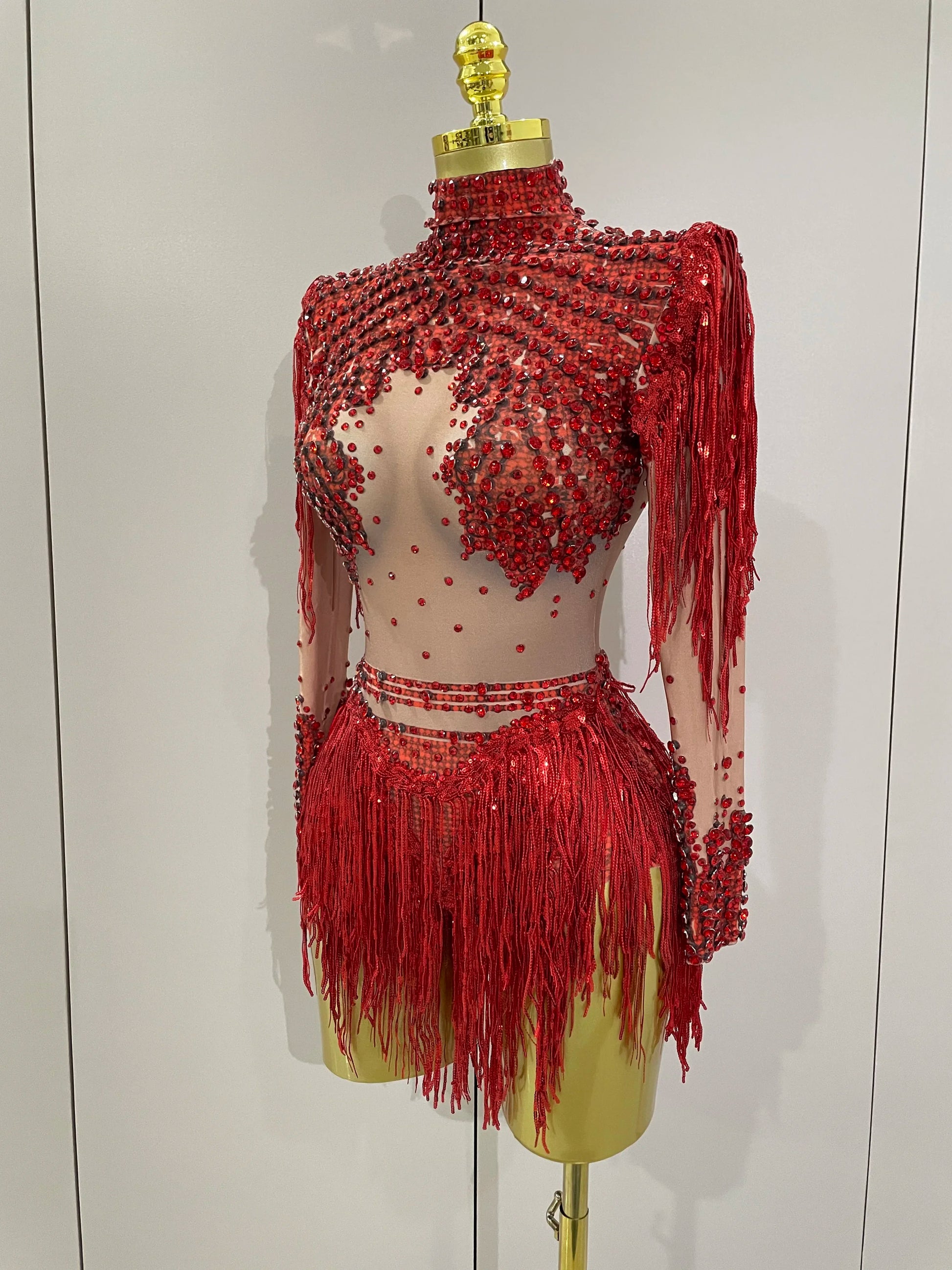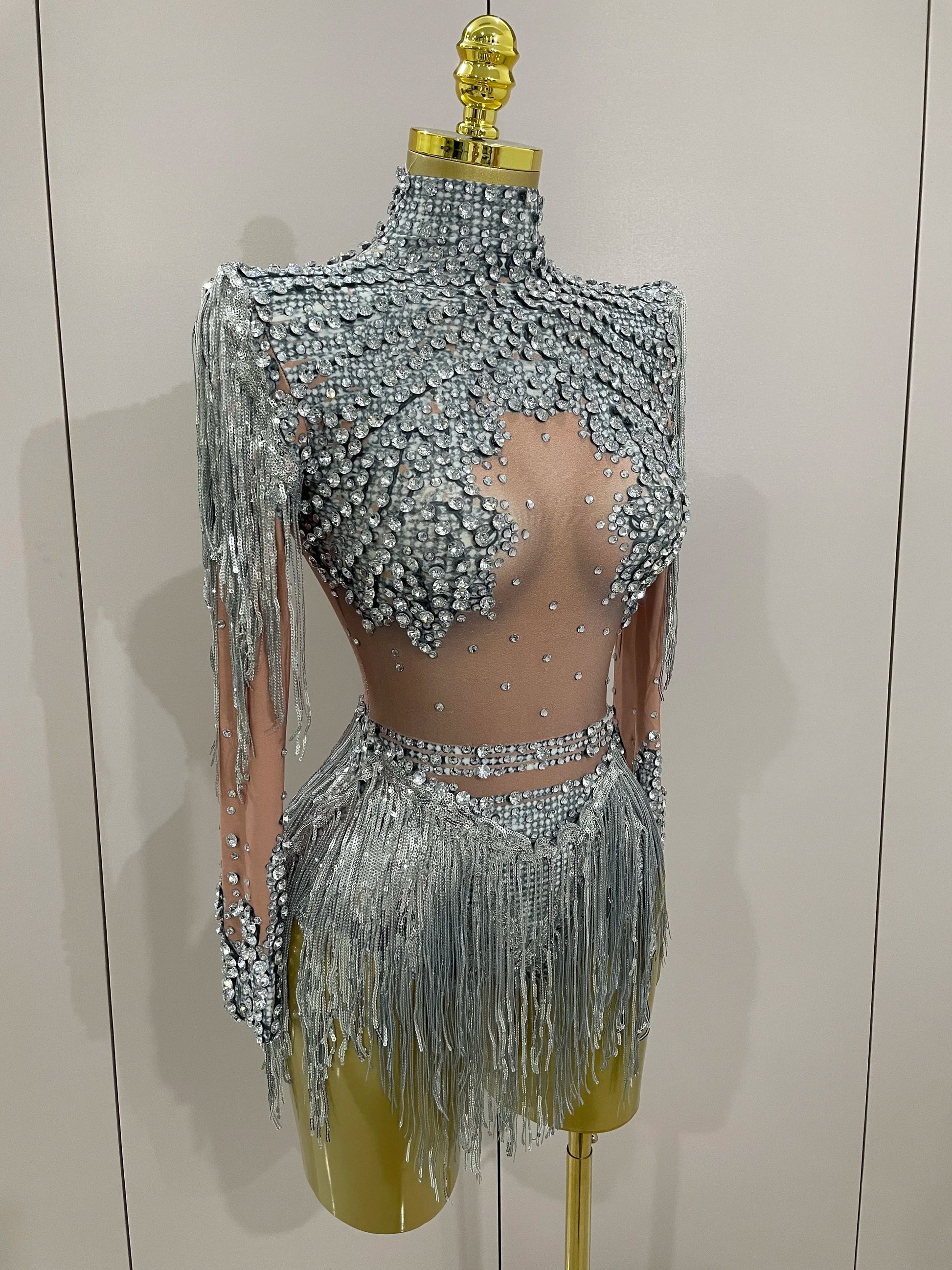 Women Sparkly Rhinestone Sequin Tassel Stretch Bodysuits 2025 New Arrival Birthday Party Nightclub Dj Stage Performance Costume