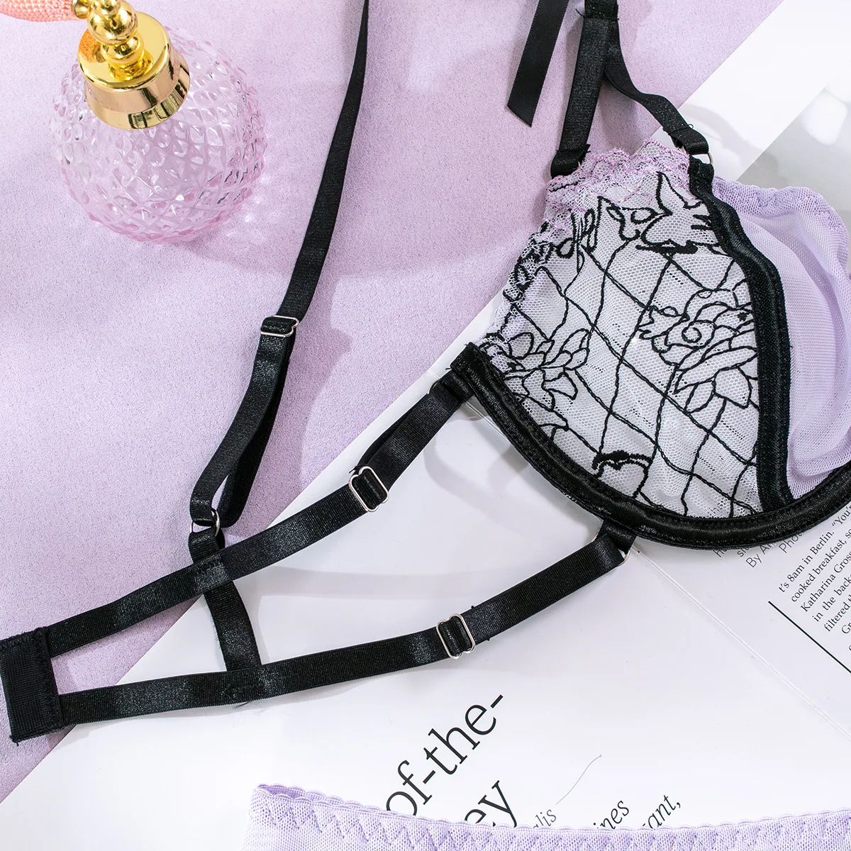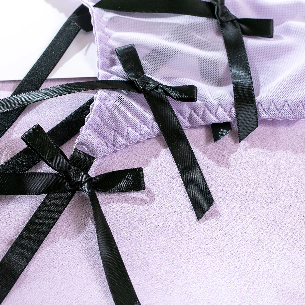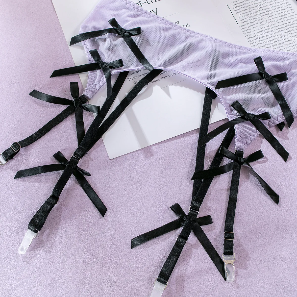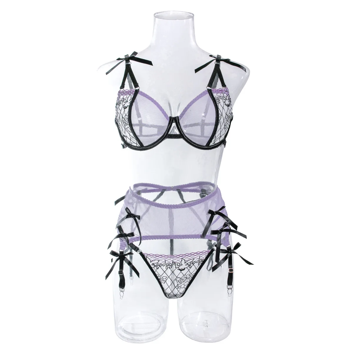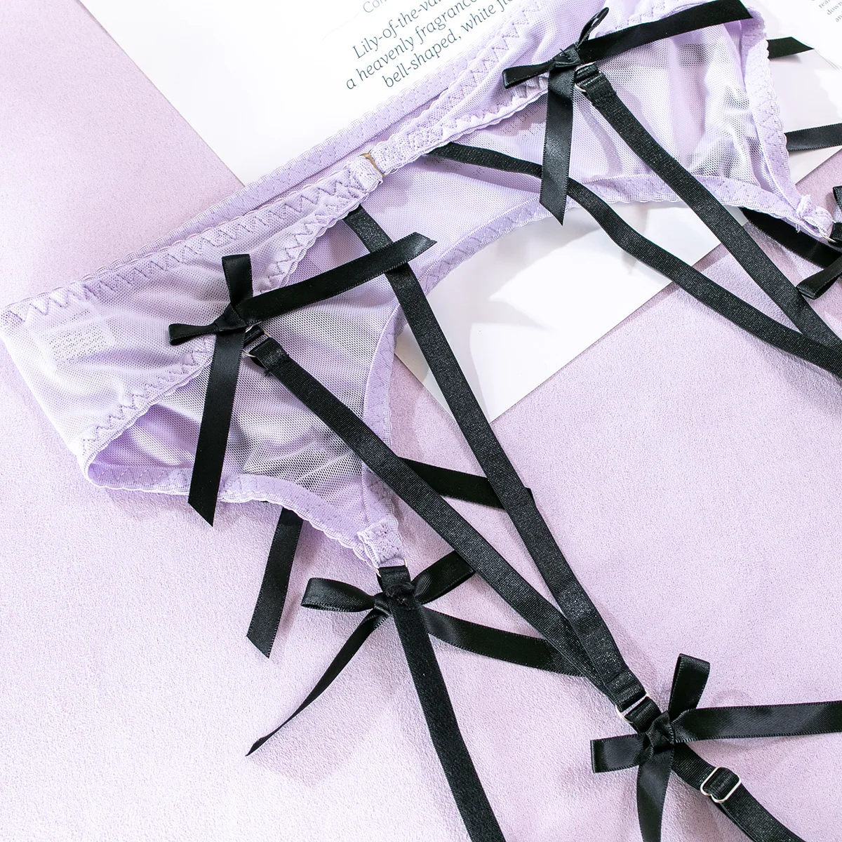 Fashion Sexy Erotic Set Women 3-Piece Lingerie Set Bow Transparent Bra + G-String Underwear Set Intimates
