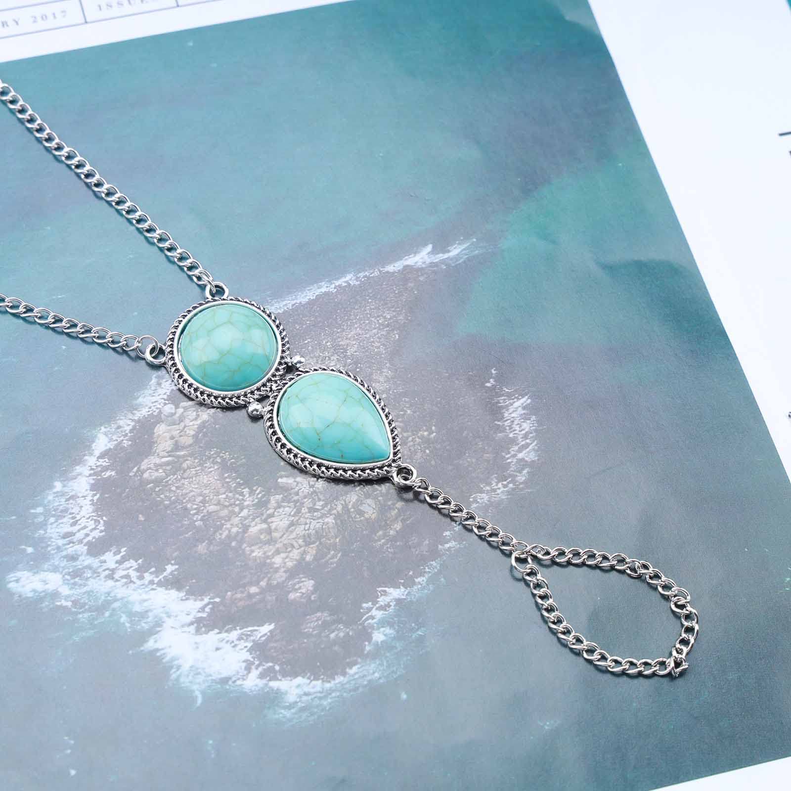 Allereya Vintage Türkis Finger Ring Armband Türkis Handgelenk Armband Silber Sklave Armband Boho Teardrop Blauen Stein Armband Tribal Hand Harness Kette Braut Hand Schmuck Für Frauen Und Mädchen