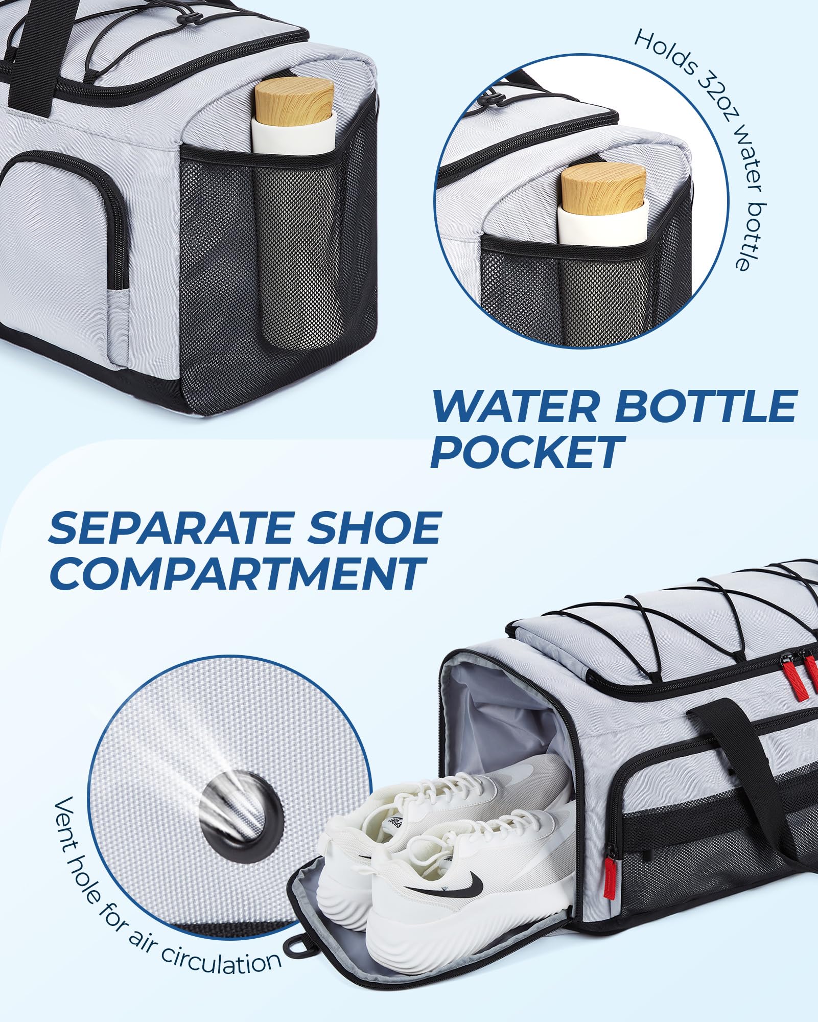 - Versatile Functionality: Our sports bag is equipped with functional pockets on both sides, including an independent shoe compartment and a water bottle pocket. The breathable design of the shoe compartment ensures proper air circulation, keeping your shoes fresh. The water bottle pocket securely holds a 32oz bottle, ensuring you stay hydrated during workouts or travels