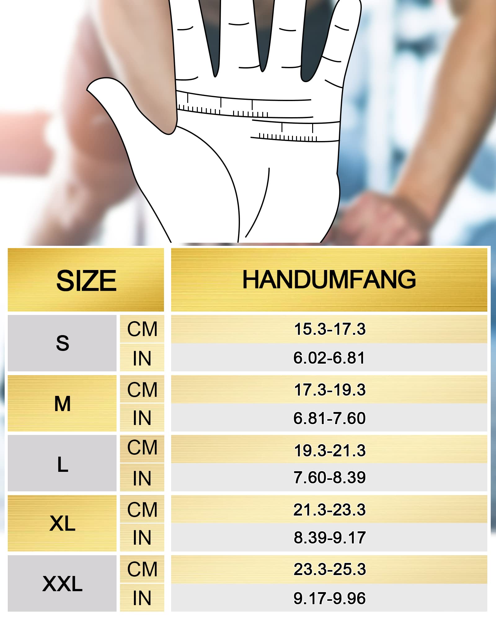 Einzelheiten: - - - - - - ➤ High quality, softness, breathability and flexibility are the most important features of our gloves. Breathable material helps to wick sweat away more quickly. Our goal is to ensure our customers don’t have a sticky sweaty feeling and so you have safe and comfortable sports experience. Hand and wrist protection: Parts with a reinforced silicone design improve shock absorption, and provide excellent anti-slip protection. Wrist supports protect your wrists from injury. Our gloves help to minimise the risk of accidental injuries and turn your training sessions into a pleasant experience. ➤ Clear design gives you excellent flexibility: Because your hands are not fully covered. You can also rotate them so you don’t have to take them off to have a drink or do other non-workout related activities at the gym. The fantastic, elasticated material feels like your own skin. ❤- - - Hand size: Please choose your gloves according to the size below: S: 15.8 - 17.8 cm. M: 17.8 - 19.8 cm. L: 19.8 - 21.8 cm. XL: 21.8 - 23.8 cm.